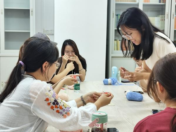 钩织活动以“校庆吉祥物”为主题,指导老师演示“短针—长针—引拔”等基础针法。同学们用彩色毛线钩织广外字母、纪念标识或吉祥物,在耐心指导下体验手工乐趣,感受劳动的意义。