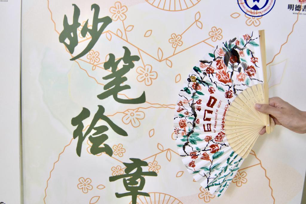 画折扇工坊以“广外十二景”为创作主题,嘉宾讲解“勾勒—皴擦—点染”的传统技法。同学们在素面折扇上自由创作,水墨晕染间呈现“云山珠水”的校园意境。