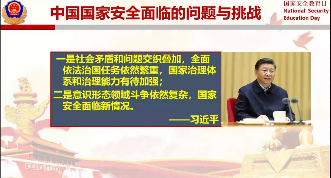 会上,甘警官从总体国家安全观、与国家安全有关的法律以及公民和组织在维护国家安全中的权利和义务三个方面给同学们进行了讲解,让同学们牢固树立维护国家安全是每个公民的责任的意识,努力推进总体国家安全观深入人心,不断强化安全意识和法律意识。之后,来自商学院19级的娜迪热、皮热扎提分别从剧目创作和社会实践活动两方面,分享自己的参赛心得,鼓励同学们积极参加比赛,享受参赛过程,提升个人综合能力。