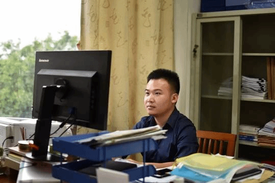 走进办公室,只见谢铭威老师在电脑前专注地工作着。手指在键盘上飞快跳动,碰撞出清脆的敲击声。桌上的文件林林总总,有的被分门别类地放在电脑旁的蓝色储物架中,有的被简单地堆叠在桌边。老师身后还有一个储物柜,里面放有各类重要档案。