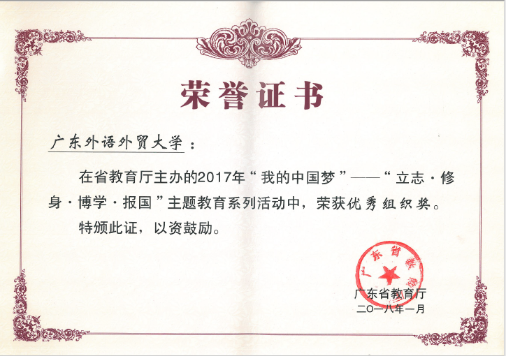本网讯 近日,在广东省教育厅主办的2017年“我的中国梦--立志·修身·博学·报国”主题教育活动中,我校荣获优秀组织奖。我校选送作品共23项获奖,分别获2项一等奖、8项二等奖,7项三等奖,及6项优胜奖。