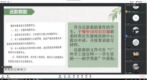 为落实贷款毕业生相关工作,切实提升学生的法治观念与诚信素养,2025年6月10日(星期二)上午,2025届毕业生国家助学贷款还贷说明暨诚信教育宣讲会在线上召开,向贷款毕业生普及还款、征信、还款计划变更、防诈骗等相关知识和注意事项,引导贷款毕业生主动履行国家助学贷款合同。本次会议由官超老师主持,学生工作部学生资助管理中心科长叶祥杰、学生资助管理中心全体老师、各学院济困指导老师、毕业班辅导员以及2025届生源地助学贷款毕业生参加。