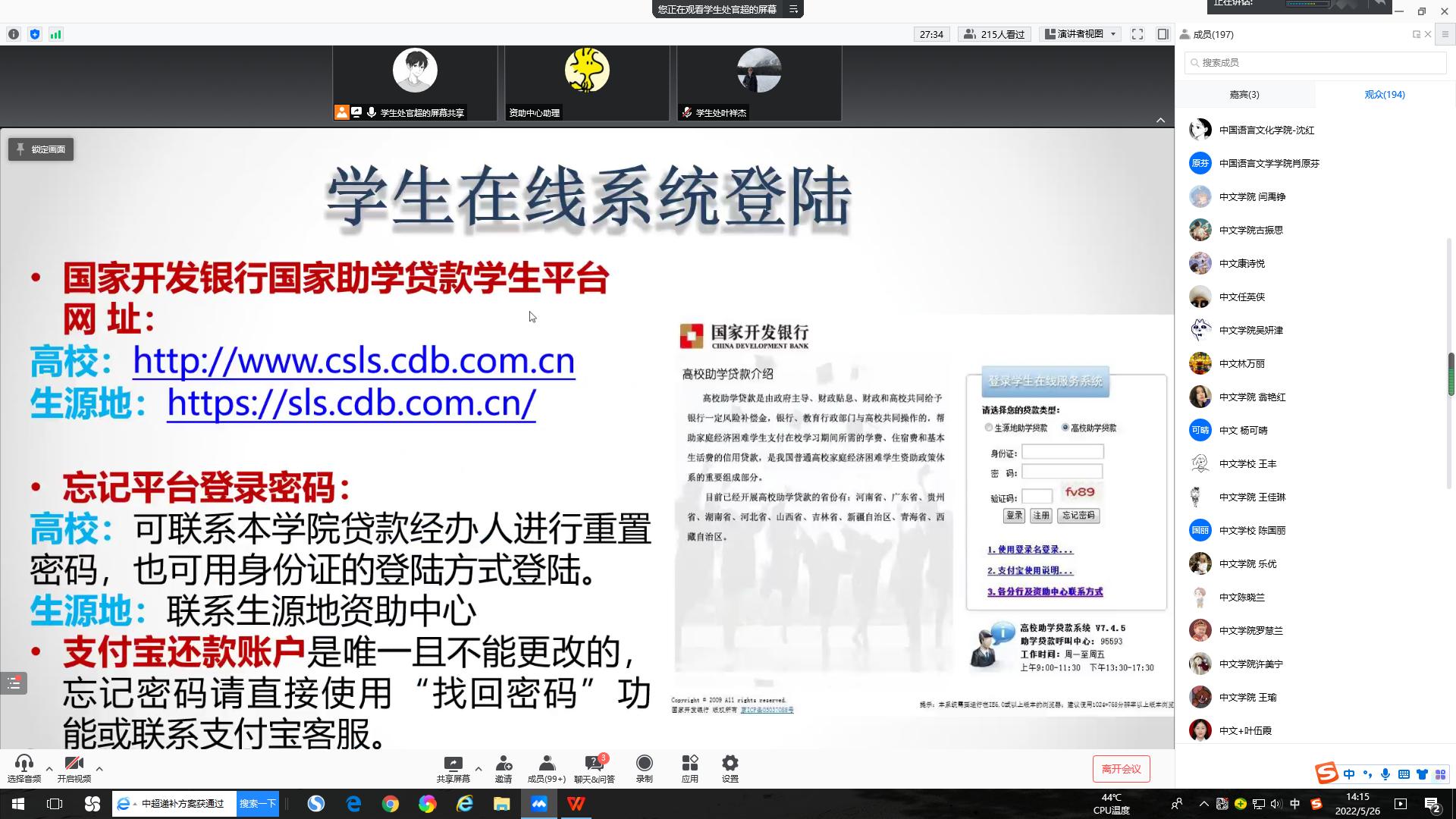 为了更好地开展贷款毕业生还贷工作,履行国家助学贷款合同,学生处与学生资助管理中心于2022年5月26日14:00在线上召开了2022届毕业生国家助学贷款还款说明及诚信教育宣讲会。学生资助中心叶祥杰科长、官超老师,各学院济困负责老师、各学院毕业班辅导员以及2022届高校以及生源地助学贷款毕业生参加了本次会议。