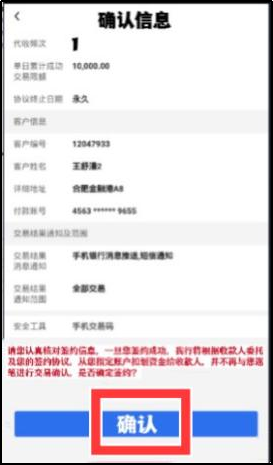 4.进入确认信息页:核对无误后点击“确认”,输入手机交易码(银行短信验证码),签约成功。