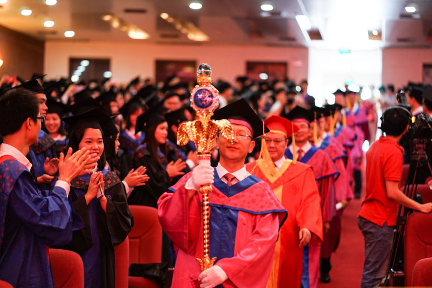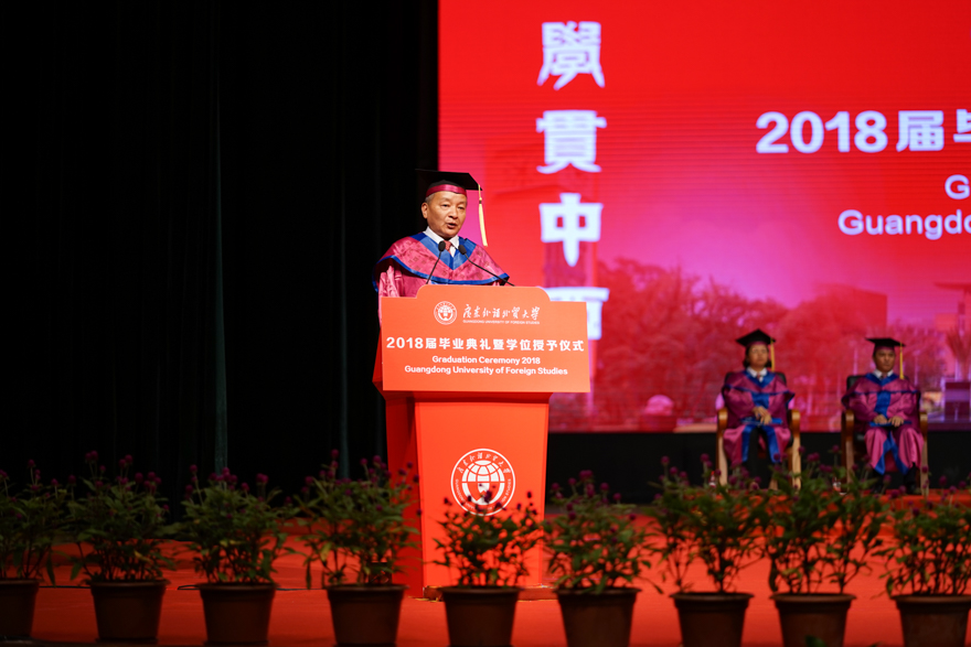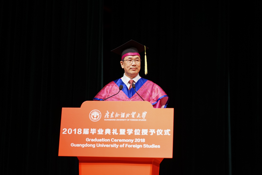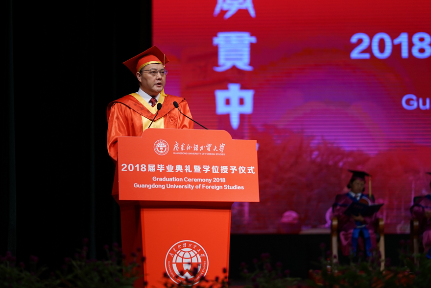 恰逢青葱岁月诗意年华,2018届毕业生们即将踏上人生新征程。6月28日上午,南校区首场2018届毕业典礼暨学位授予仪式在大会堂举行。在广外的最后一课,校长石佑启勉励毕业生们要“秉承‘卓越、诚信、包容、自信’的广外价值观,深怀一颗爱国心、敬畏心、平常心、进取心,做新时代有为青年。南校首场毕业典礼是马克思主义学院、经贸学院和新闻学院专场,由副校长何传添主持,副校长陈林汉和阳爱民、导师代表、校董代表、校友代表、家长代表出席。