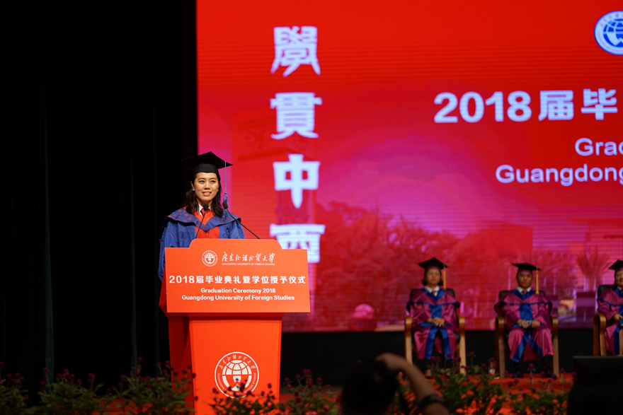 校友代表2004届经贸学院的毕业生谢梦分享了她从南方报业的财经记者起步到如今的青年创业者的经历——她认为这十年是一个通过毕业时的选择,而重新认知自我的过程。她还回忆了自己在2008年夏天拿到梦寐以求的北大录取通知书的经历,以此勉励同学们要为真正的热爱奋力拼搏。她强调:“坚信自己的选择,并在一个热爱的领域专注到卓越,假以时日,一定能够在人生的赛道上脱颖而出。”她期待同学们未来可以特别坦然又骄傲地说,“我们不曾枉为广外人”,祝福同学们“从青年到暮年,我们都不曾远离这所大学教我们的初心”。