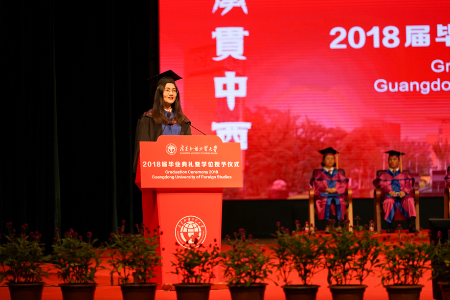 来自经贸学院的毕业生王佩真对同为经贸学院的校友代表谢梦的讲话感触颇深:“她身上传承的正是一代广外人的精神。”正如谢梦所说,毕业后,名校的光环逐渐褪去,个人的成长更多的取决于个人的选择,对此,王佩真直言认同。她坚信事在人为,将为自己的选择而奋斗。