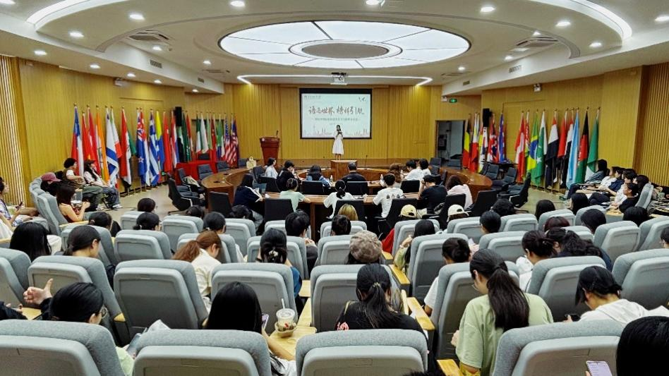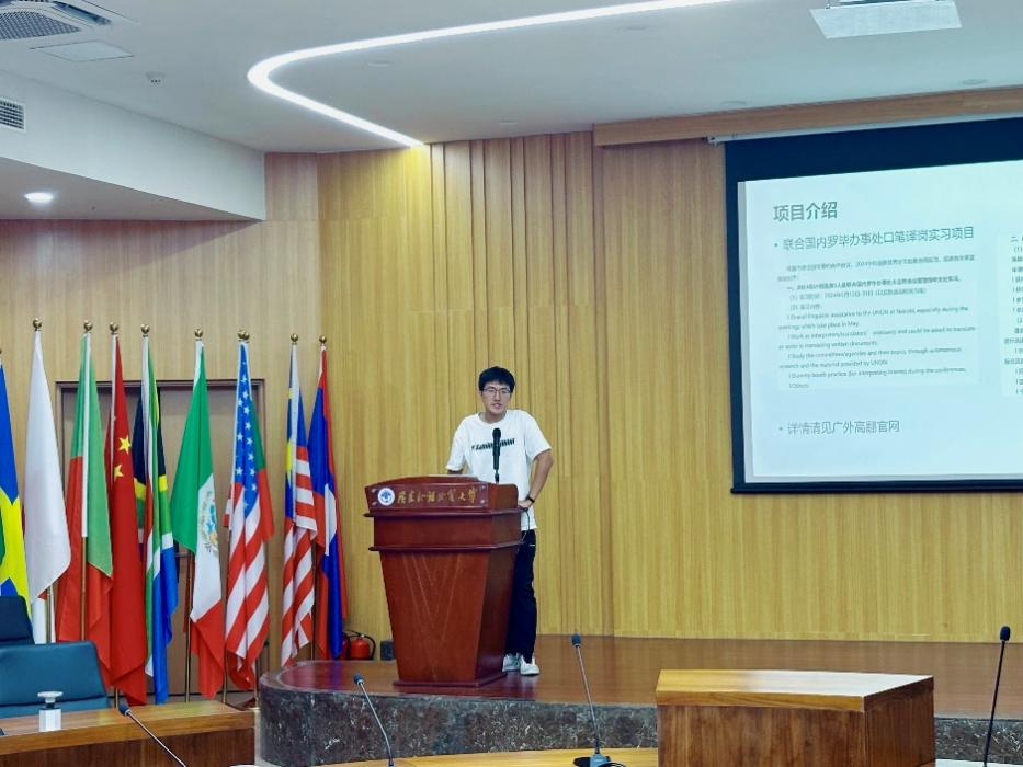 汤智宇则结合自己在联合国内罗毕办事处的翻译工作经历进行分享。他讲述了自己在实习过程中遇到的趣事,并强调了作为一名翻译工作者必须具备的敏锐文化洞察力和跨文化交际能力。他鼓励同学们要坚定自己的职业目标,不断提升自己的专业素养。