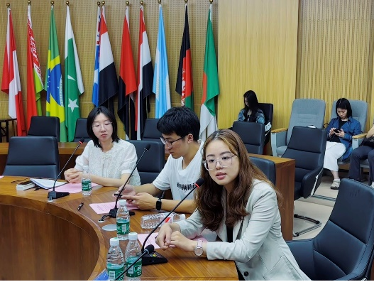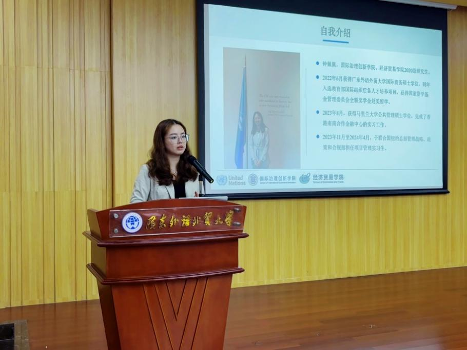 随后,三位国际组织优秀实习生依次作经验分享。钟佩佩从联合国系统的运作、员工构成、心得体会等方面分享了她在联合国总部的实习经历。她表示,成为一名合格的国际组织工作者,不仅需要具备扎实的专业技能,更需要有责任感和使命感。她的分享让大家深刻感受到了联合国的多元文化和作为中国青年讲好中国故事的责任感。