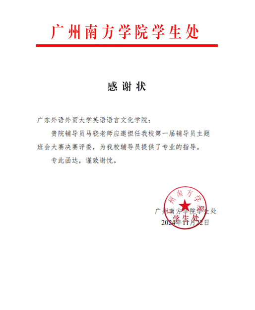 本网讯 11月22日,广州南方学院第一届辅导员主题班会大赛决赛顺利举行,我校“微光成炬”青年文化引领工作室(党团活动指导类)主持人马骁受邀出席赛事并担任评委。在点评发言中,马骁就班会、党团活动等辅导员阵地建设的方式方法提出了工作思路,并就主题班会如何解决学生适应问题、学习问题以及团结问题等给出了指导建议。