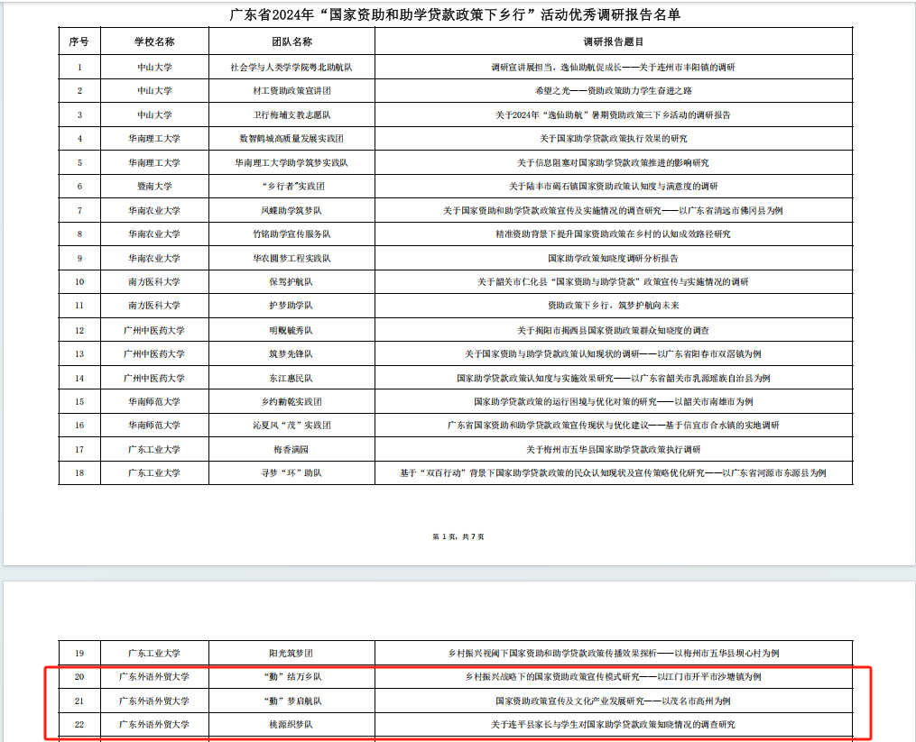 在本次资助下乡宣传活动中,“勤”结万乡队、桃源织梦队、“勤”梦启航队3支队伍的调研报告获广东省2024年“国家资助和助学贷款政策下乡行”活动优秀调研报告,“勤”结万乡队队长方可淇和桃源织梦队队员方玮晴获优秀实践队员荣誉称号,学生资助管理中心颜求实和魏晟民获优秀指导老师荣誉称号。