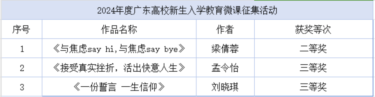 近日,由广东高校网络思想政治工作中心、广东高校易班发展中心组织开展的2024年度广东高校新生入学教育微课征集活动公布评审结果,我校3名辅导员老师荣获相关奖项,其中二等奖1项,三等奖2项。