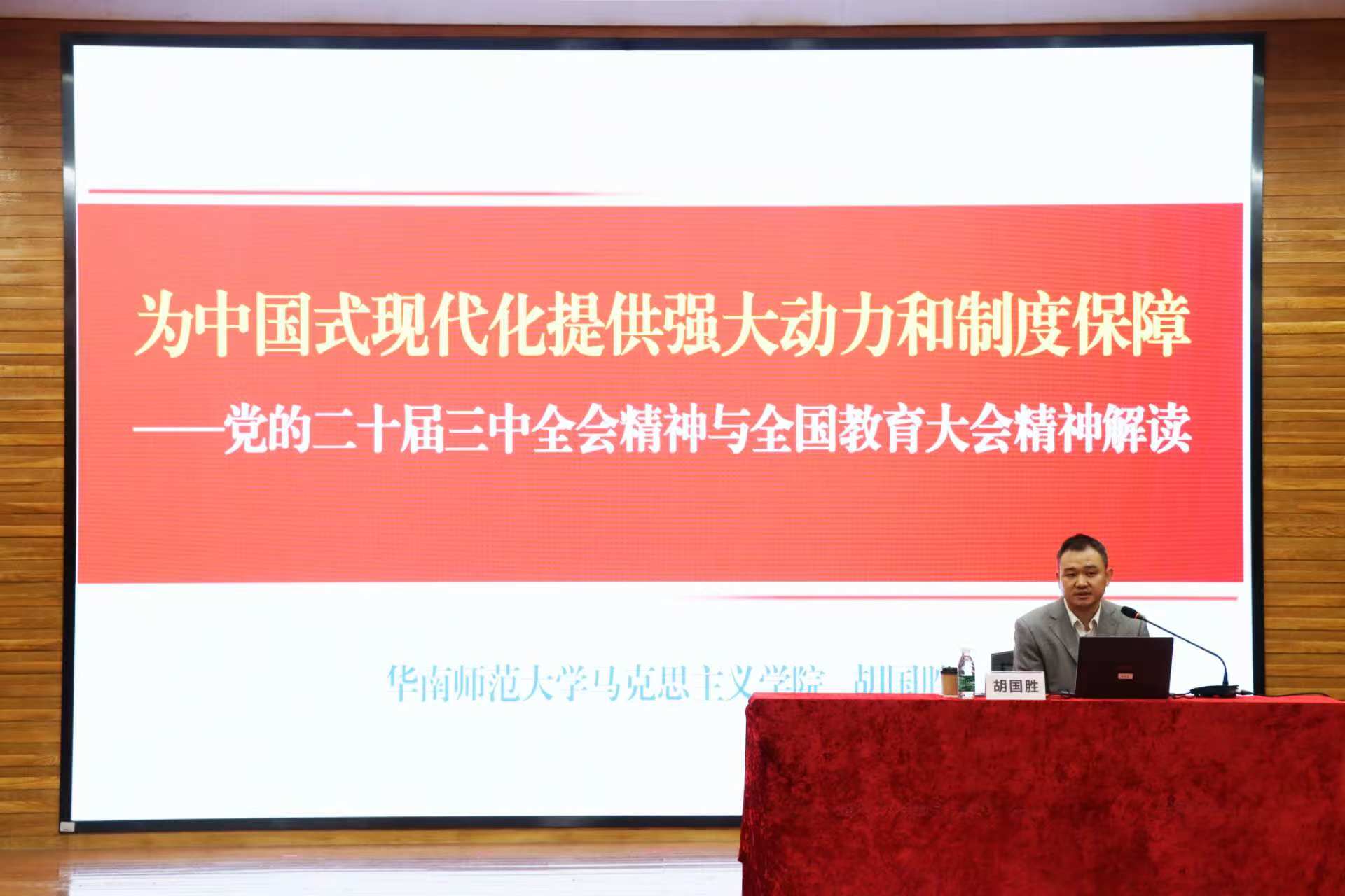 据悉,本次会议还邀请了华南师范大学马克思主义学院党委书记胡国胜教授以《为中国式现代化提供强大动力和制度保障——党的二十届三中全会精神与全国教育大会精神解读》为题作讲座,围绕《中共中央关于进一步全面深化改革、推进中国式现代化的决定》和习近平总书记在全国教育大会上的重要讲话,对进一步全面深化改革、全面推进教育强国建设等内容进行了深入讲解和系统阐释。