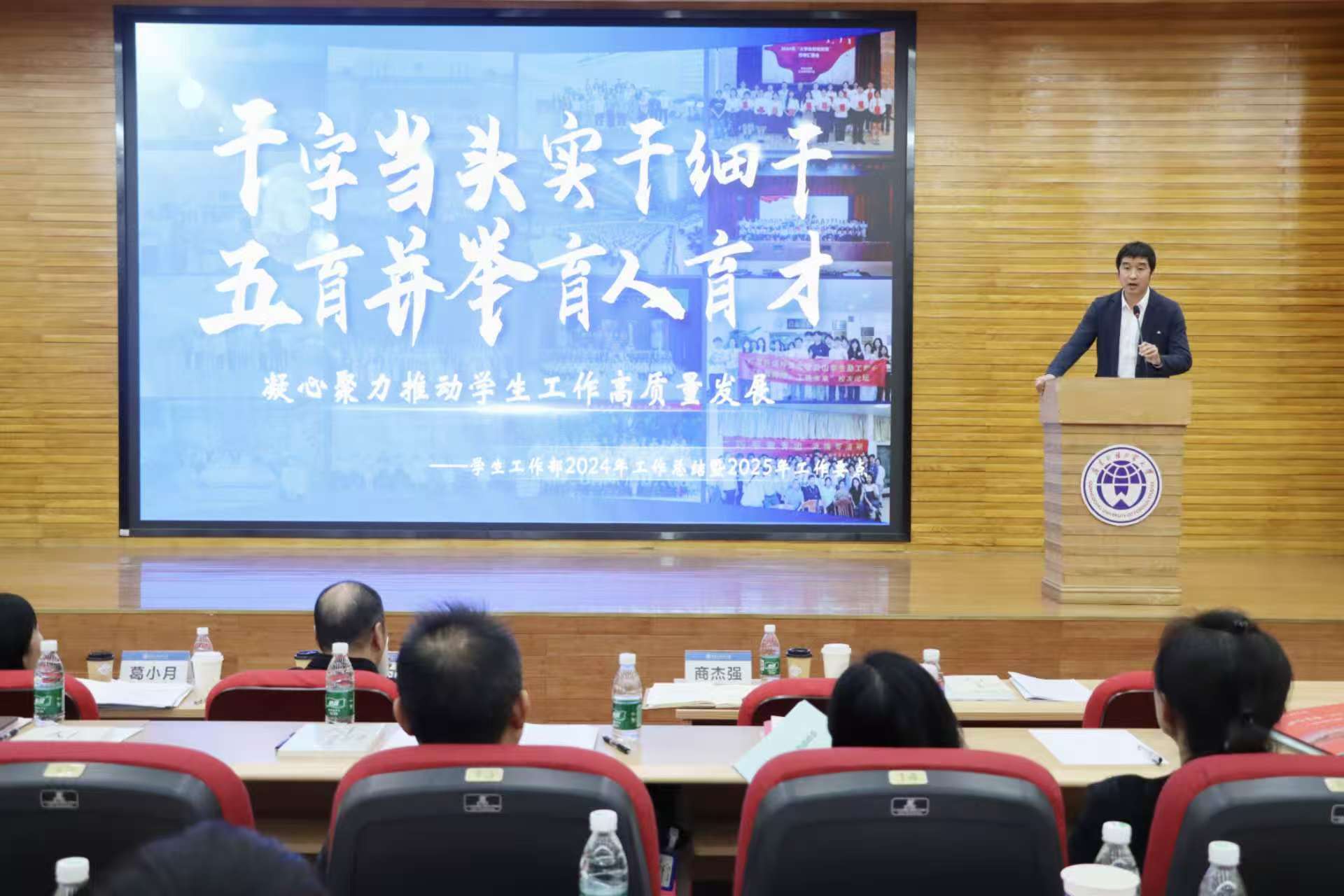 商杰强以“干字当头实干细干 五育并举育人育才”为主题对学生工作部2024年的工作进行了总结,并强调在接下来的一年中,应在学工队伍建设、学生社区发展、学风校风建设、学生安全保障、心理健康教育、勤工助学支持以及信息平台建设等多个领域持续发力,以推动我校学生工作再上新台阶、再创新局面。