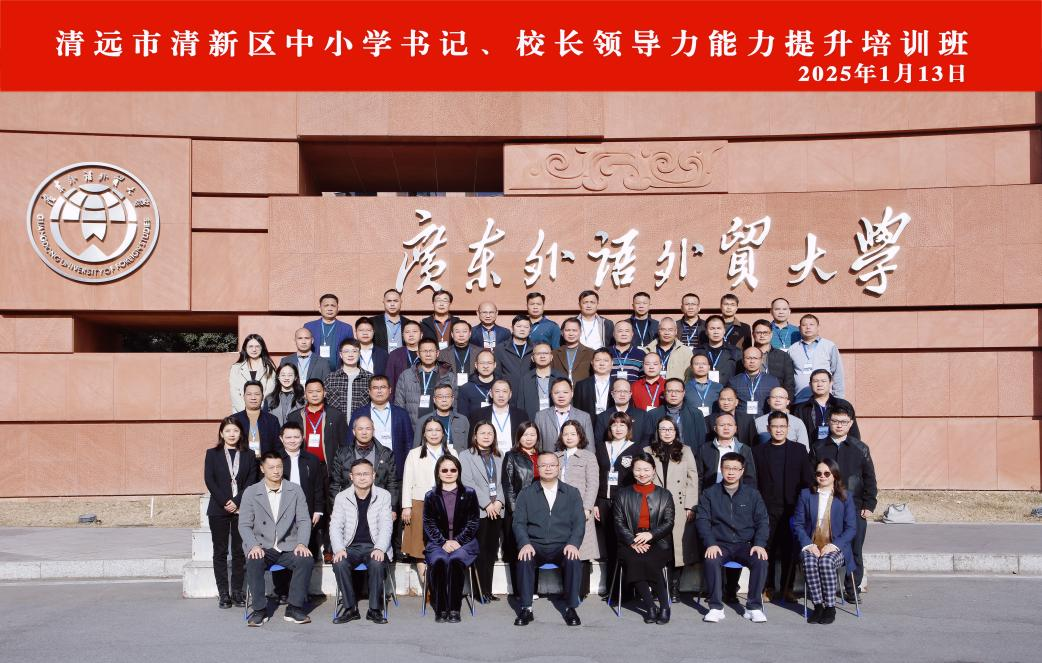 2025年1月13日,清远市清新区中小学书记、校长领导力能力提升培训班开班仪式在广东外语外贸大学白云山校区国际会议厅举行。培训班为期5天,由广东外语外贸大学、广东交通职业技术学院和清新区教育局共同主办,广东外语外贸大学高等继续教育学院承办。广东外语外贸大学党委副书记葛小月,清新区副区长温俭良,广东外语外贸大学党委常委、组织部部长黄秀娟,广东交通职业技术学院副院长熊嘉逸,清新区教育局局长丰志毅等出席开班仪式。广东外语外贸大学高等继续教育学院党委书记胡海娟主持开班仪式。