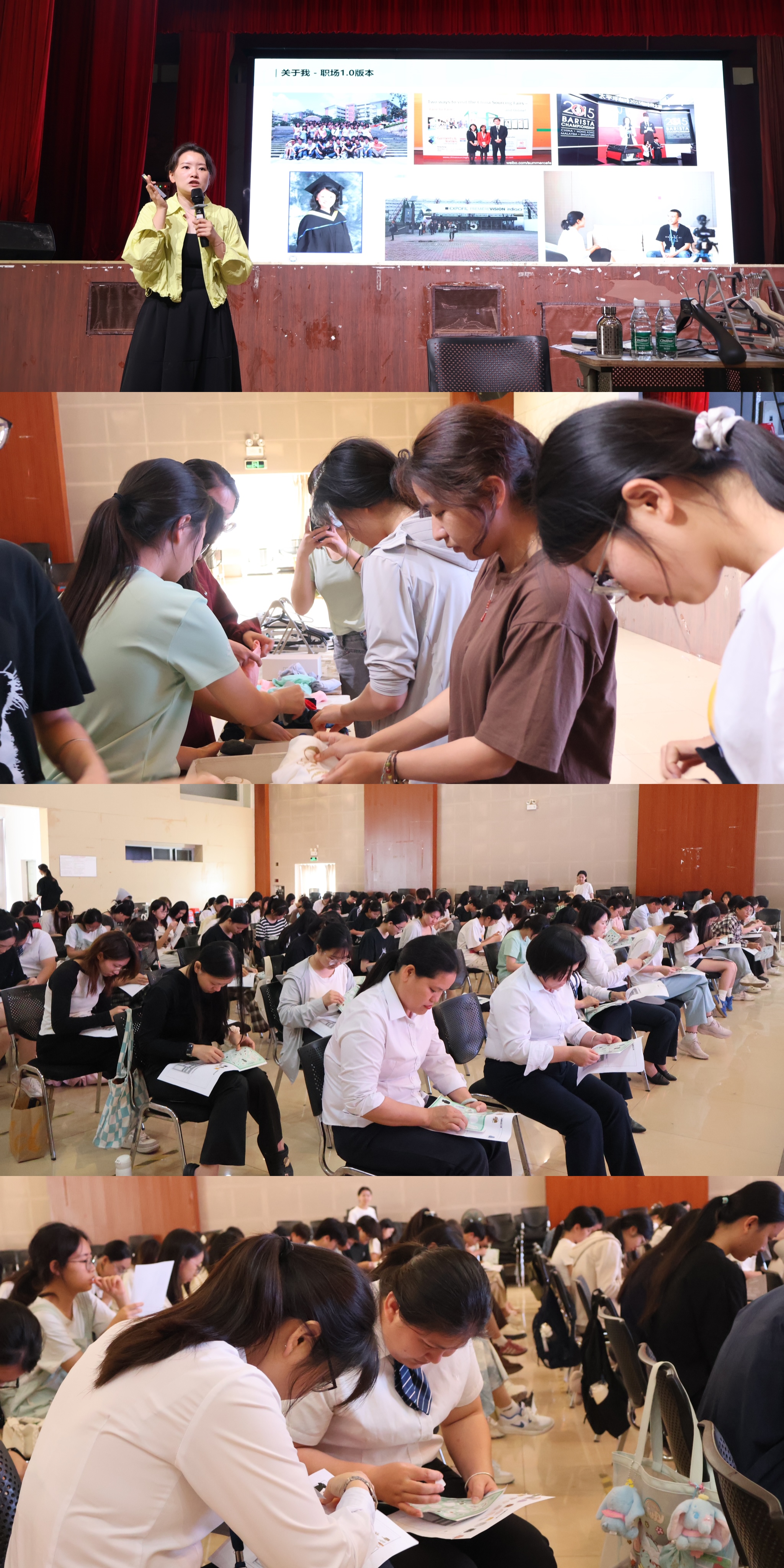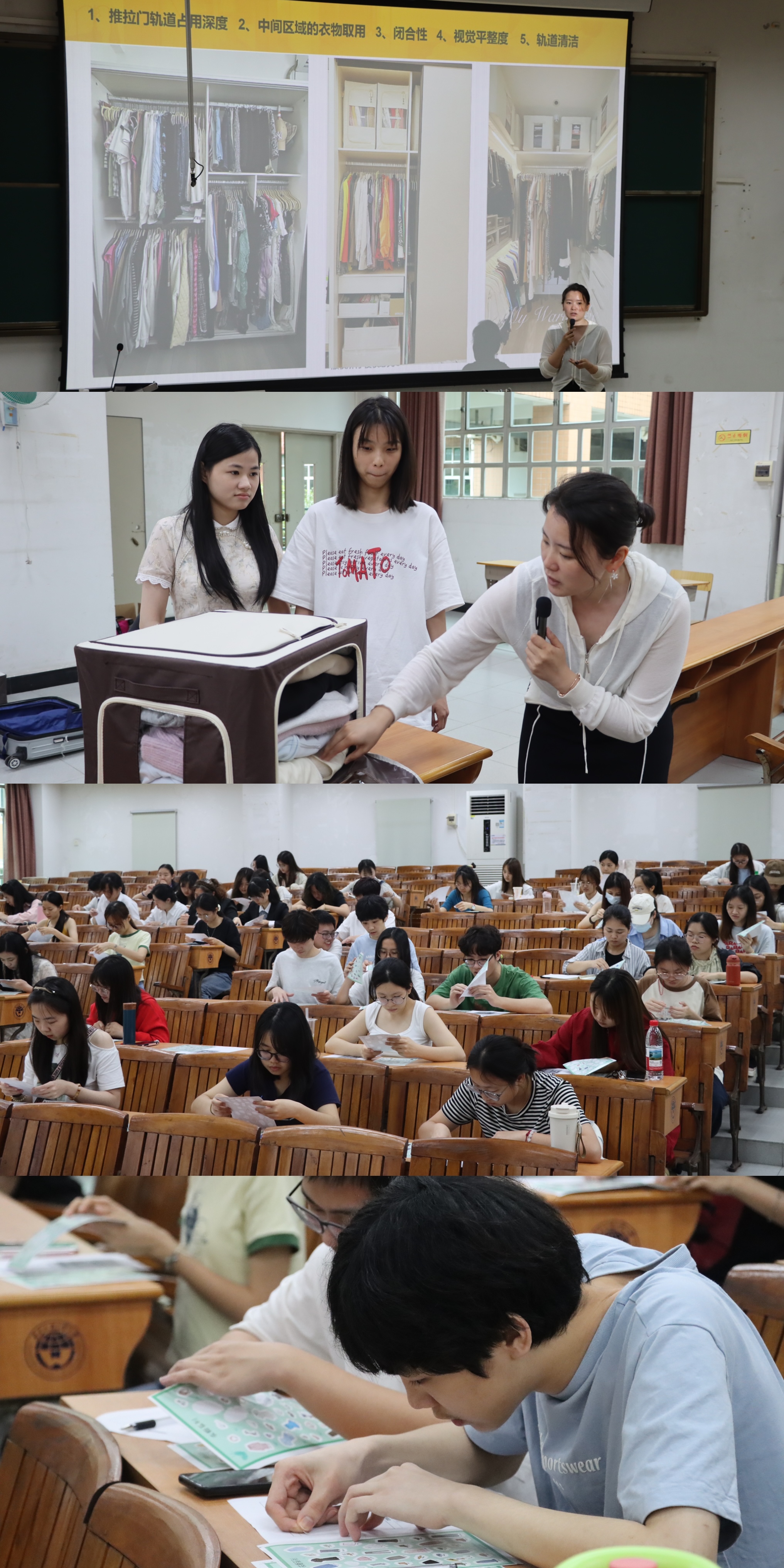 黄漪夏校友通过原理分析、案例讲解、实操探索等方式为师生带来了一堂专业有效、生动有趣的收纳整理课。她提出“宿舍收纳的核心不仅是对重复囤积物品的‘断舍离’,更是根据空间布局对物品进行有序高效的分类和整理”,引导学生学会整理的思维与逻辑。针对 “空间小物品堆积” 难题,黄漪夏通过案例剖析,帮同学们找出日常收纳的错误习惯与难点。活动现场多个实操摊位同步开放,设置了智解收纳、场景模拟、折物归箱和旧物焕新四大模块。同学们在轻松的音乐中,于有趣的摊位间穿梭,充分体验到了收纳整理的魅力。