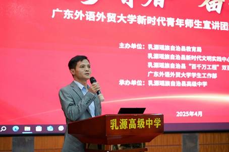 “教育的意义不仅是走出大山,更是带着大山的馈赠走向世界。未来的我将从乳源出发,经广外磨砺,向世界奋进!”4月25日下午,广外新时代青年师生宣讲团成员走进乳源瑶族自治县高级中学开展“逐梦青春,奋斗有我”宣讲活动,引领新时代青年勇担时代重任,投身百千万工程,迸发青春蓬勃力量。韶关市乳源自治县教育局副局长余周,广外驻乳源“双百行动”服务队队长、广外学生工作部副部长毕建永,省委党校驻乳源“双百行动”服务队副处长胡春林,乳源高级中学副校长熊国辉出席本活动。