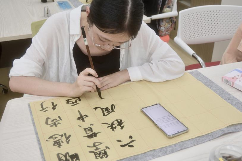 活动现场按手工材质与工艺特点划分五大区域,指导嘉宾与参与者互动热烈,传统技艺在青春指尖焕发光彩。书法工坊以智永“永字八法”为基础,指导同学们书写“广外六十载”“明德博学”等题字。同学们在砚台墨香中学习提按顿挫的技巧,以楷书、行书等书体创作,笔锋间凝结对母校的深情。