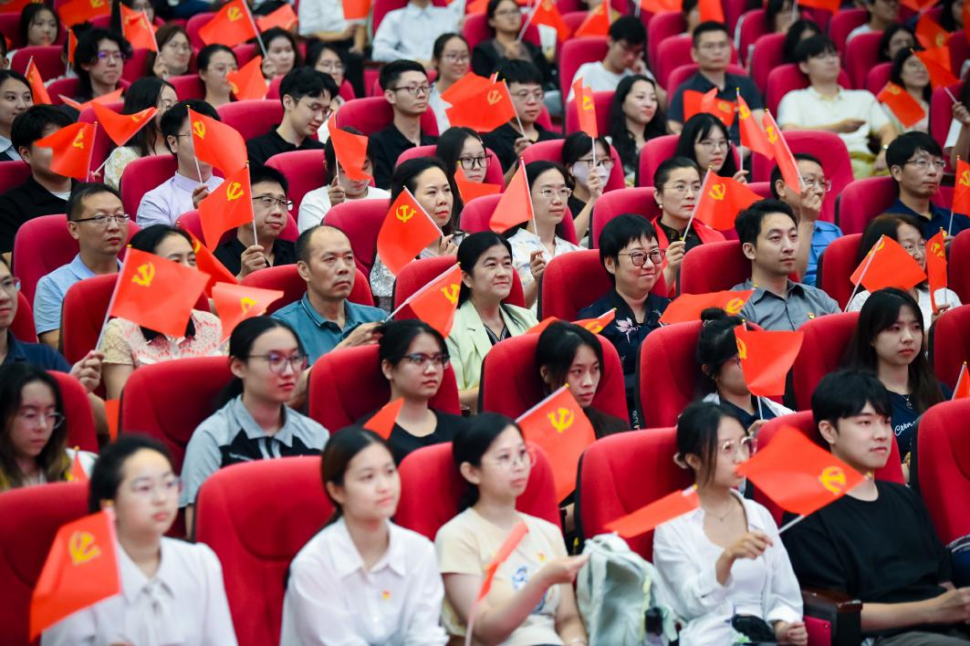 2025年7月1日晚,“思想的光芒”主题音乐党课暨“风起云山 六秩弦歌”广东外语外贸大学60周年校庆思政课在白云山校区六教报告厅顺利举办,此次活动由广东外语外贸大学学生工作部主办,广东外语外贸大学“润心”艺术工作室、“易路相伴”网络文化工作室承办。此次音乐党课将音视频、歌曲演唱、诗歌朗诵等艺术呈现形式相融合,集理论学习、音乐鉴赏、沉浸体验于一体,为现场师生带来一场思想和艺术的盛宴。广东外语外贸大学党委常委、组织部部长黄秀娟,学生工作部部长国佳,学生就业创业中心主任康为茂,学校相关单位的党员干部、教师和离退休教师党员代表、全体辅导员、学生党员和入党积极分子代表、青马班和云山先锋班成员、新时代青年师生理论宣讲团成员等400余人参与活动。