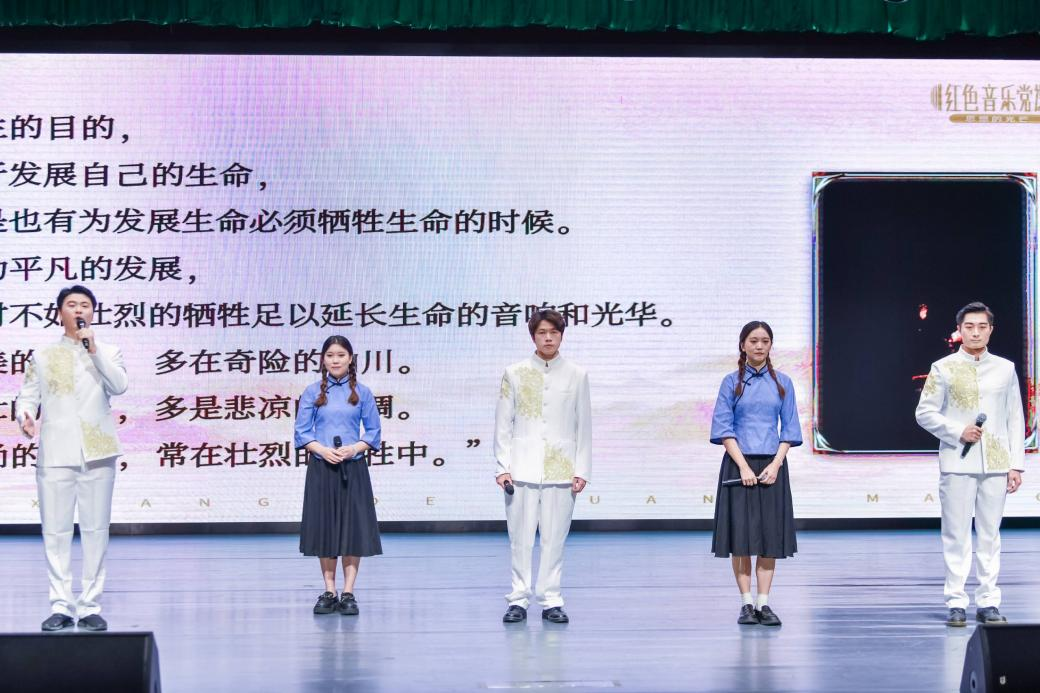 在展现党的历史发展和学校峥嵘岁月的丰富图文视频背景下,以《牺牲》等六个节目现场演绎沉浸互动其中,由来自各学院的师生代表深情演绎诗歌朗诵及音乐作品,诗朗诵《牺牲》和歌曲《十送红军》,沿着历史脉络,将中国共产党艰苦卓绝的奋斗历程娓娓道来,《春天的故事》歌颂改革开放取得的伟大成果,展现万象更新的壮丽场景与朝气蓬勃的时代气息,《长江之歌》让观众感受到祖国江河的奔腾前进画面,仿佛听到时代在前进的声音。