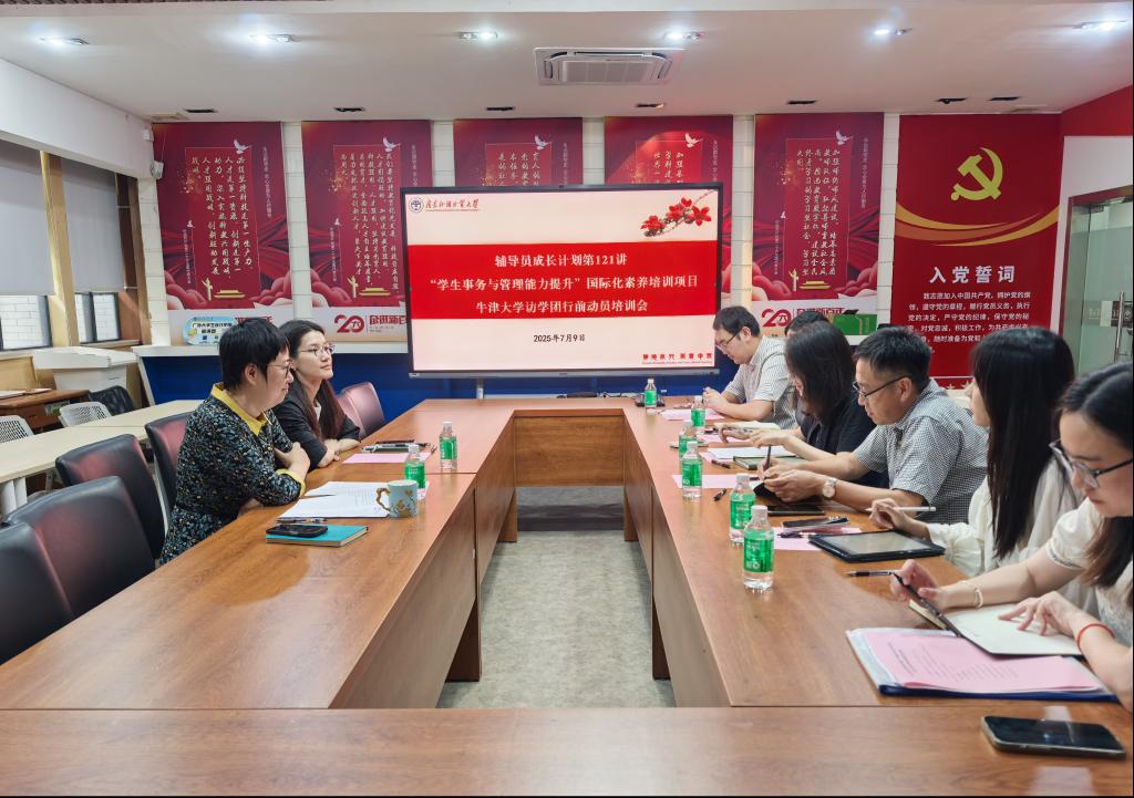 7月9日上午,我校“学生事务与管理能力提升”国际化素养培训项目牛津大学访学团行前动员培训会在白云山校区六教B106举行。学生工作部部长国佳、国际交流合作部国际项目科科长王晞、牛津大学访学团成员出席会议。会议由学生工作部思想政治教育科科长高晴主持。