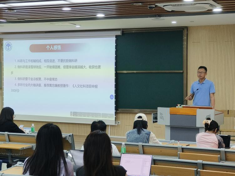会上,万东方老师结合自己的课题,以习近平总书记关于英雄文化重要论述为例分享自己的课题申报经验,强调项目申报前奠定理论基础的重要性,并分享了他对申报书、选题、研究思路等相关内容的个人见解,为辅导员破解科研难题提供了经验参考和实践方向。他指出,科研与辅导员工作相辅相成,相互促进,不要抗拒做科研,鼓励在场辅导员勇敢尝试,甘坐冷板凳,不断开拓。