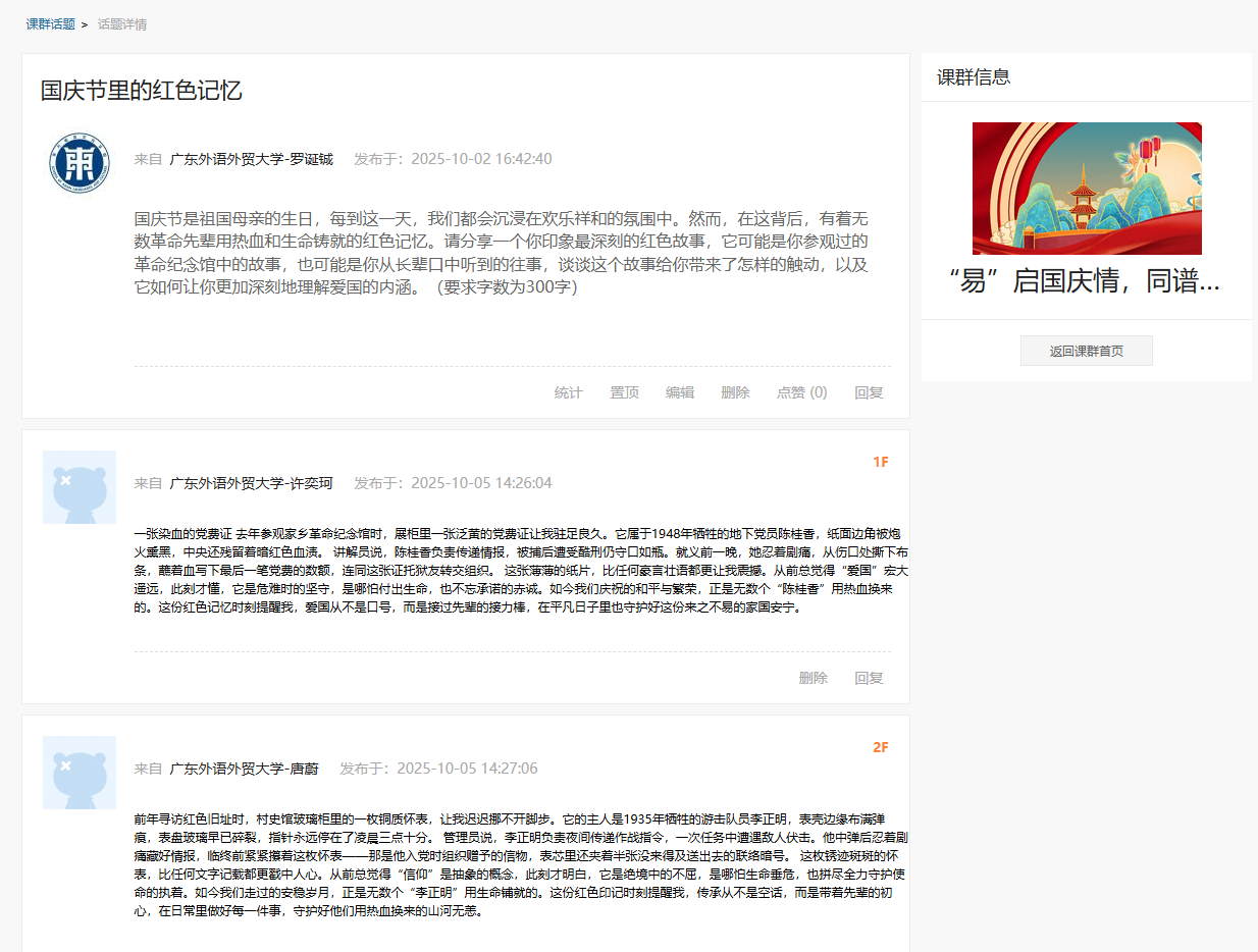 此外,各学院积极运用易班、微博、小红书等网络平台组织开展主题活动,拓展活动覆盖面与影响力,引导学生广泛参与、热切互动。东南亚学院开展“‘易’启国庆情,同谱盛世篇”主题活动,引导学生深刻理解祖国发展历程,激发民族自豪感与爱国情怀。翻译学院通过易班优课平台推出“读一封抗战家书、学一个英雄故事、看一部红色影片”系列活动,组织学生研读赵一曼、凌其昌、左权等革命先烈的家书与事迹,观看《建党伟业》《万里归途》等红色影片,并在平台踊跃分享感悟,形成“人人参与、人人发声”的生动氛围。商学院在易班优选上线“铸牢中华民族共同体意识”与“弘扬抗战精神,做新时代中国青年,铸造民族复兴中流砥柱”两大专题课题。课题融入东江纵队抗战故事、全民族共御外侮的史实资料,结合“中华民族一家亲”的时代内涵,通过图文、短视频等形式,阐释抗战精神中“同心同德、共赴国难”的团结伟力与共同体理念的历史渊源,为持续深化学习奠定理论基础。亚非学院开展了“易心颂华诞,青春献礼新时代——与国旗同框”网络打卡活动,在“易班”平台发布“与国旗同框”主题合影。参与者以创意构图、真挚寄语,展现新时代青年与祖国同心同行的精神风貌。
