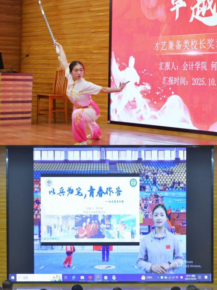 才艺兼备领域的两位同学各展所长、全面发展:会计学院的何雅淇自幼习武,获中国大学生武术套路锦标赛查拳冠军、广东省大运会枪术金牌等荣誉,且学业名列前茅;社会与公共管理学院的谭雨婷在武术长短兵领域成绩亮眼,曾获中国大学生武术长短兵锦标赛女子甲A组第一名与多项省级荣誉,以运动精神传递青春活力。