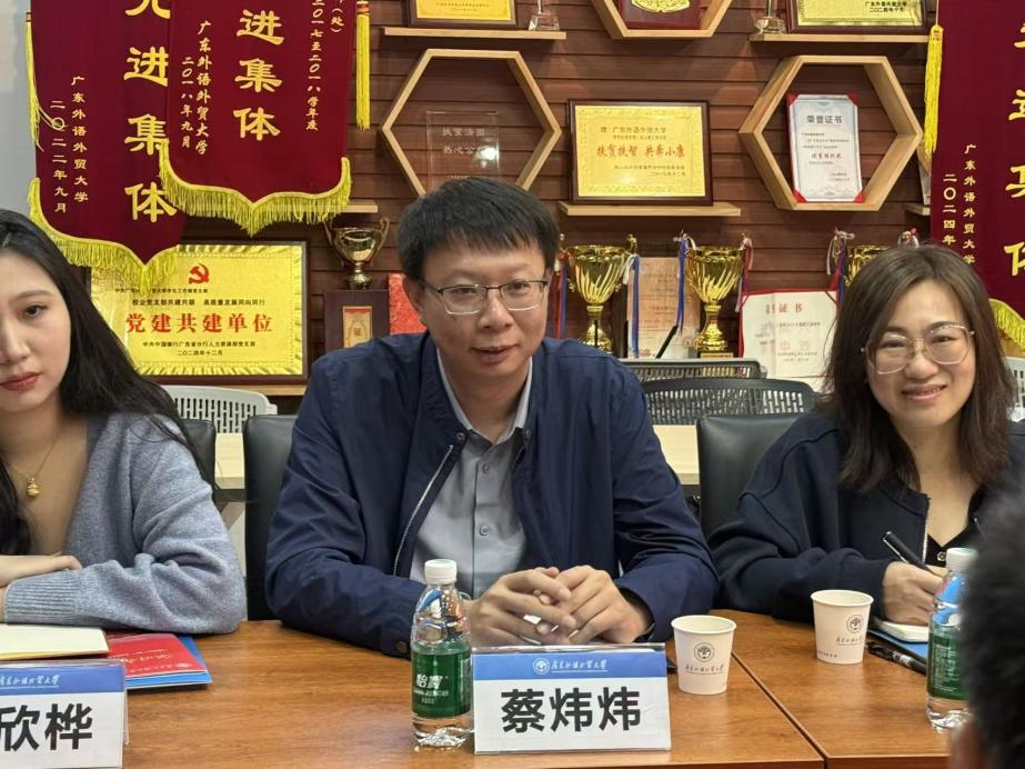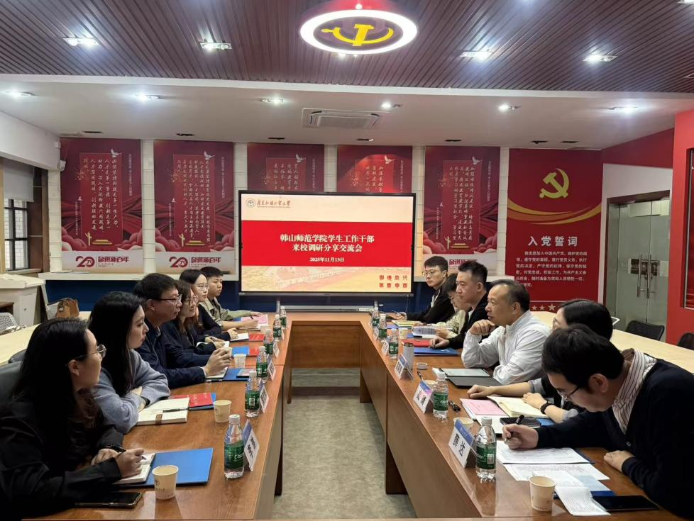 为深入贯彻落实立德树人根本任务,深化校际交流合作,提升思政工作水平,2025年11月13日上午,韩山师范学院学生工作干部一行来我校开展调研交流。韩山师范学院学生工作部副部长蔡炜炜、学生教育科科长陈秋婉及辅导员代表,广东外语外贸大学学生工作部副部长赵观音、思想政治教育科科长高晴、学生信息中心科长范磊和辅导员代表参加会议。