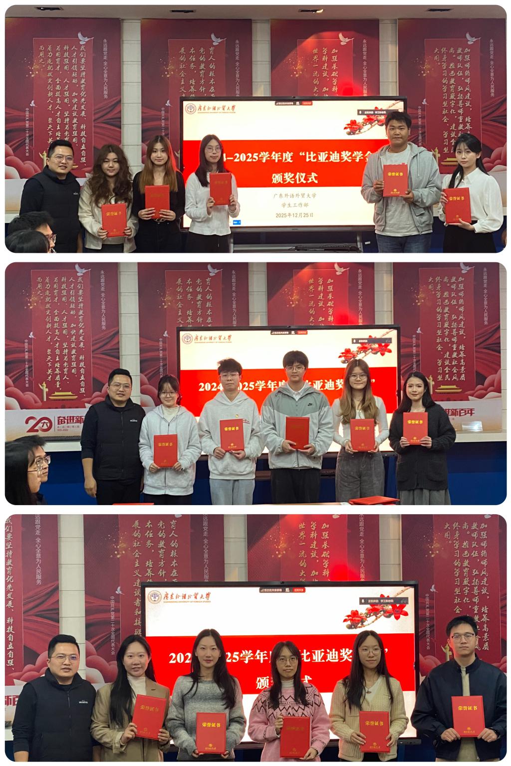 12月25日下午,2024-2025学年度“比亚迪奖学金”颁奖仪式在白云山校区六教B106多功能会议室举行。学生工作部相关老师及本学年全体获奖学生出席。仪式由学生管理科陈润旭老师主持。