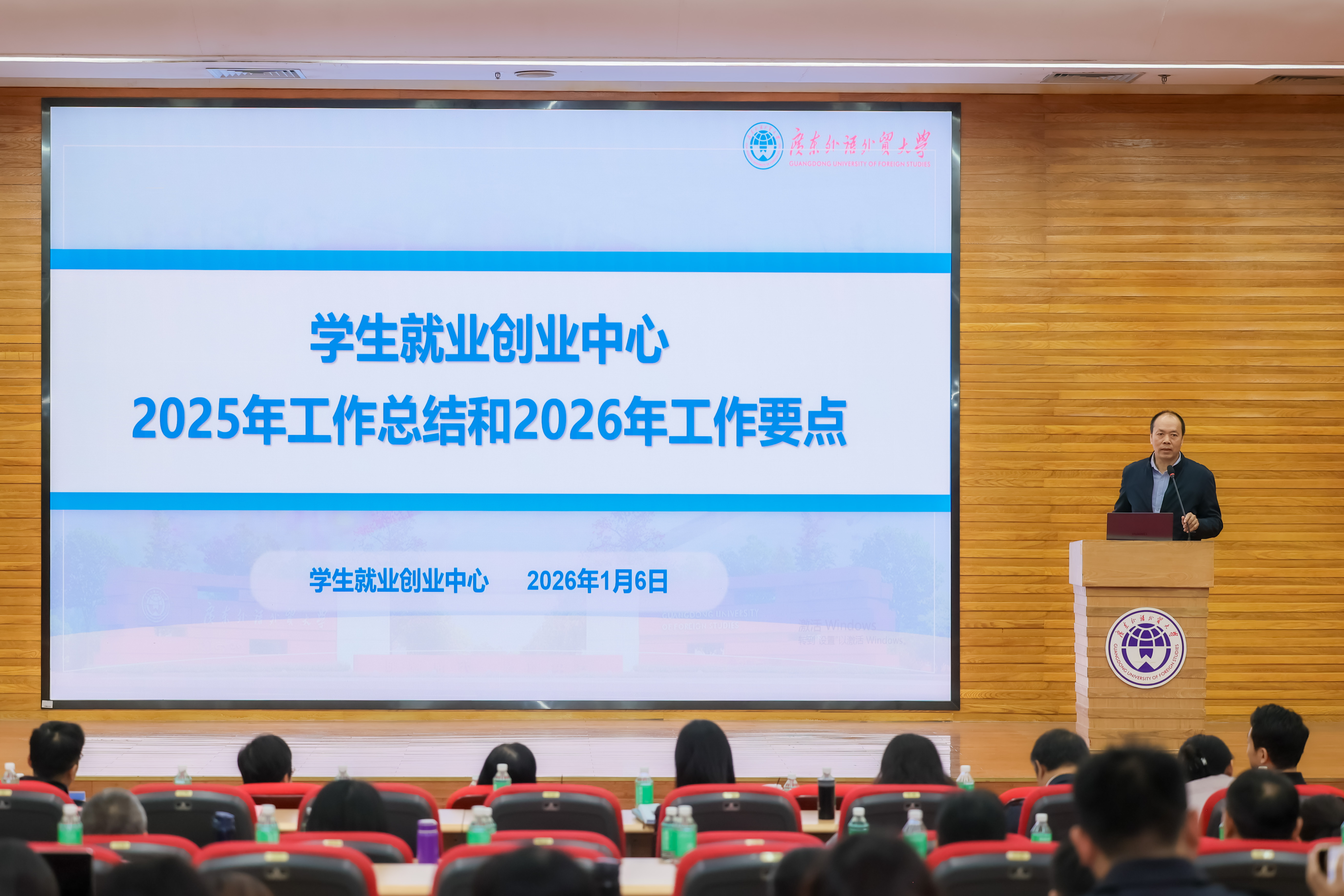 2026年1月6日我校在白云山校区图书馆报告厅召开2025年学生工作总结会。校党委副书记葛小月、学生工作部、校团委、学生就业创业中心全体人员,各单位分管学生工作负责人以及全体辅导员参会。学生工作部副部长侯运男主持会议。