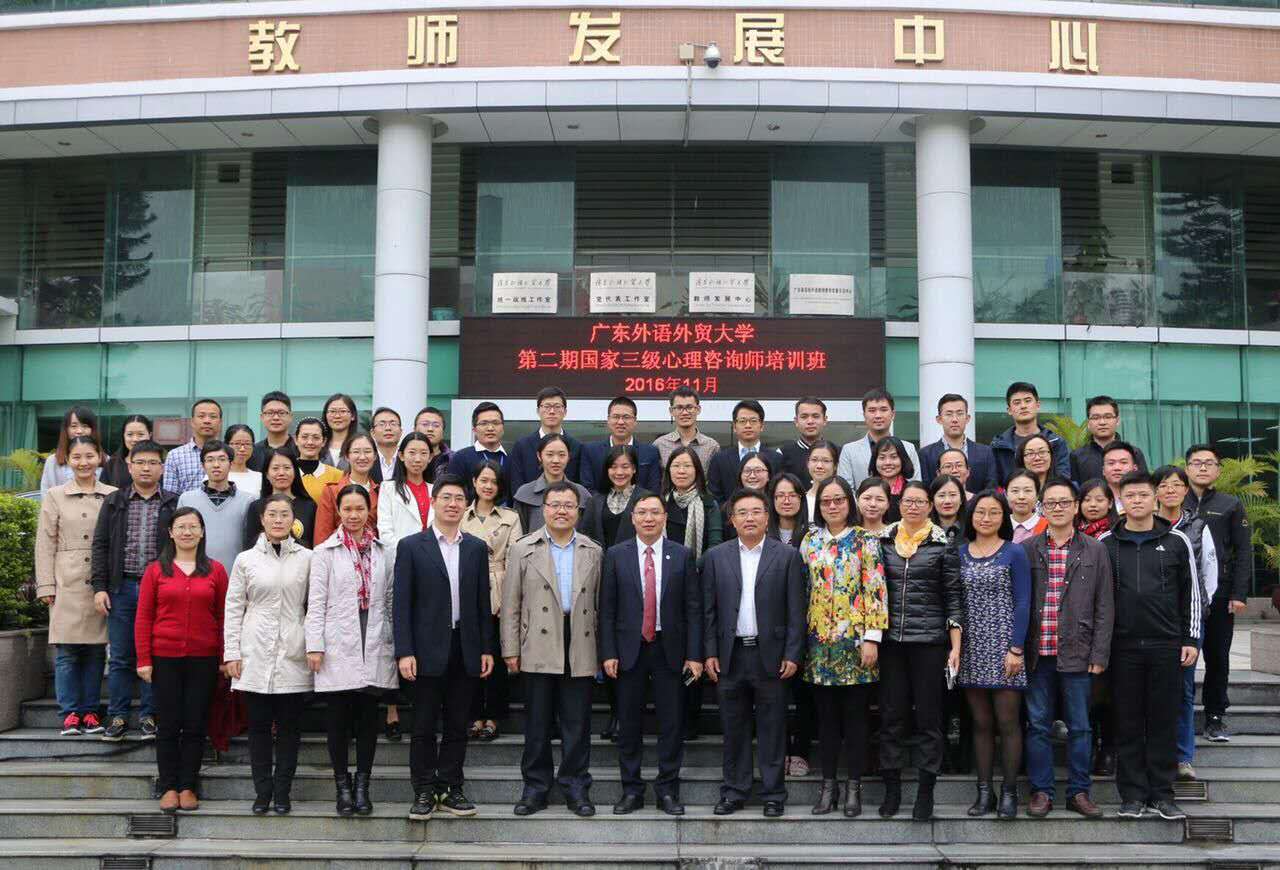 2016年11月11日下午14:00,由学生工作部(处)心理健康教育与咨询中心、教师发展中心共同举办的广外第二期国家三级心理咨询师培训班在教师发展中心105室开班。我校副校长刘海春,学生工作部(处)长谢应东,教师发展中心主任孙远雷,心理健康教育与咨询中心老师以及参与培训的学员参加了开班仪式。仪式由学生工作副部(处)长国佳主持。