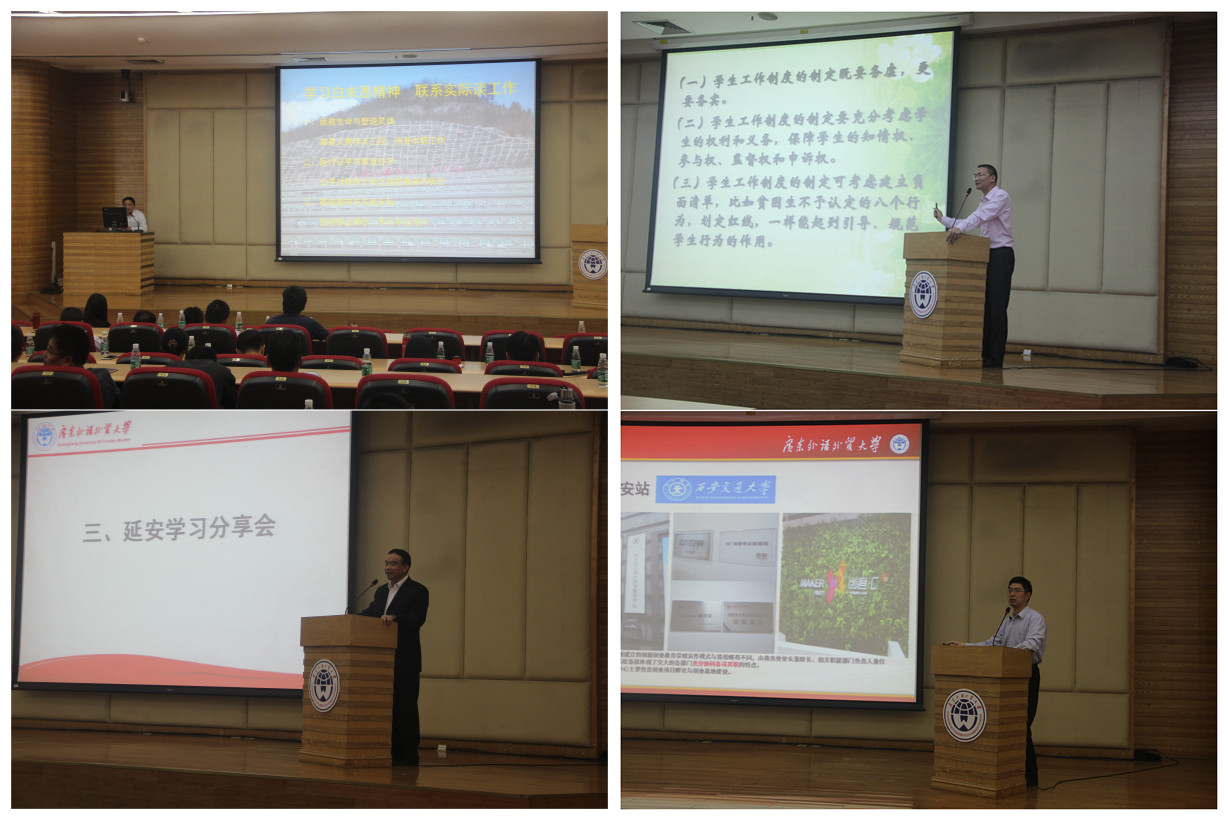 会上,我校近日赴延安、西安学习的学生工作干部进行了经验分享。4月12日-14日,为加强我校学生工作干部队伍建设,学习兄弟高校学生工作先进经验,提升学生工作干部队伍的思想认识和工作觉悟,我校组织13名学生工作干部赴延安大学泽东干部学院开展学习培训,并赴部分西安高校交流学习。本次学习分享会上,学员们分别就在延安、西安的收获以及对延安精神的理解,谈了自己的学习体会。在延安的体验式教学,革命先烈的英雄事迹和无私奉献的伟大精神,让学员们深受触动。他们结合自身工作实际,借鉴在延安、西安的学习收获,提出了针对我校学生工作的改进与创新的建议和见解。听了分享会后,台下的其他同事也表示很有启发。