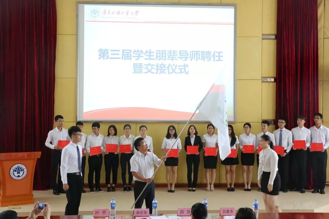 第三届学生朋辈导师聘任暨交接仪式,由第二届学生朋辈导师协会会长黄金珍出旗,学生处处长谢应东为第三届学生朋辈导师代表授旗。一本聘书,一面旗帜,是新老一届朋辈导师的传承,背后却是一份责任、一片热诚的传承!此仪式极大地鼓舞了新一届学生朋辈导师的工作热情,让新一届的学生朋辈导师们在接下来的一年工作和学习中不忘初心,勇敢向前,谱写美好的青春篇章。