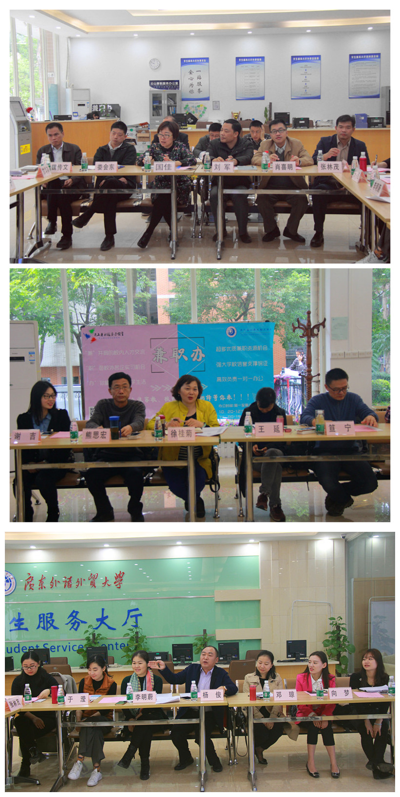 12月15日上午,四川外国语大学俄语系党总支书记杨俊一行,以及中南财经政法大学学生资助管理中心主任兼学工部副部长徐桂菊等一行来我校进行学生工作经验交流。交流座谈会在我校北校区学生服务大厅举行。我校学生工作副部(处)长国佳、刘军,就业指导中心副主任娄会东,创新创业教育学院副院长肖喜明,经济贸易学院党委副书记魏传文,国际商务英语学院党委副书记张林茂,西方语言文化学院党委副书记陈华荣,学生处相关人员等出席交流会。会议由国佳主持。