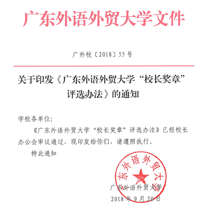 近日,为选树优秀学子典型,促进学校学风建设,我校新出台了《广东外语外贸大学“校长奖章”评选办法》(广外校〔2018〕55号)。