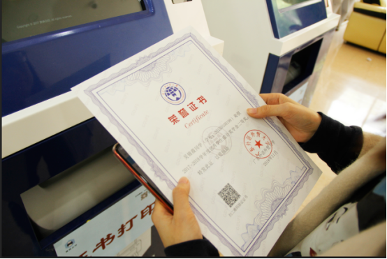 日前,学生奖状自助打印机在南北校学生服务大厅亮相,学生只需操作3个步骤,10秒内即可拿到属于自己的证书。该自助打印设备可打印校级“奖学金”和“优秀学生”等荣誉称号共计 2 大类17种荣誉证书。