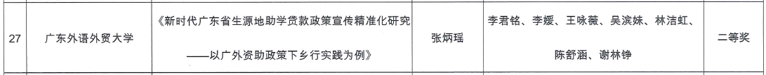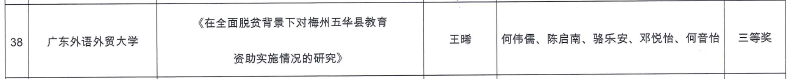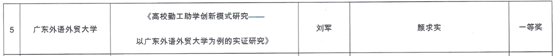 近日,广东省高校奖学助学工作专业委员会公布了《关于表彰2018学度广东省高校学生资助先进工作者的通知》和《关于公布2018年度广东省高校学生资助工作研究结项课题的通知》。我校学生工作部(处)张炳瑶和西方语言文化学院辅导员张悦欢被评为广东省高校学生资助先进工作者。学生工作部(处)刘军、张炳瑶和英语语言文化学院辅导员王晞,分别获得结项课题一等奖、二等奖和三等奖。