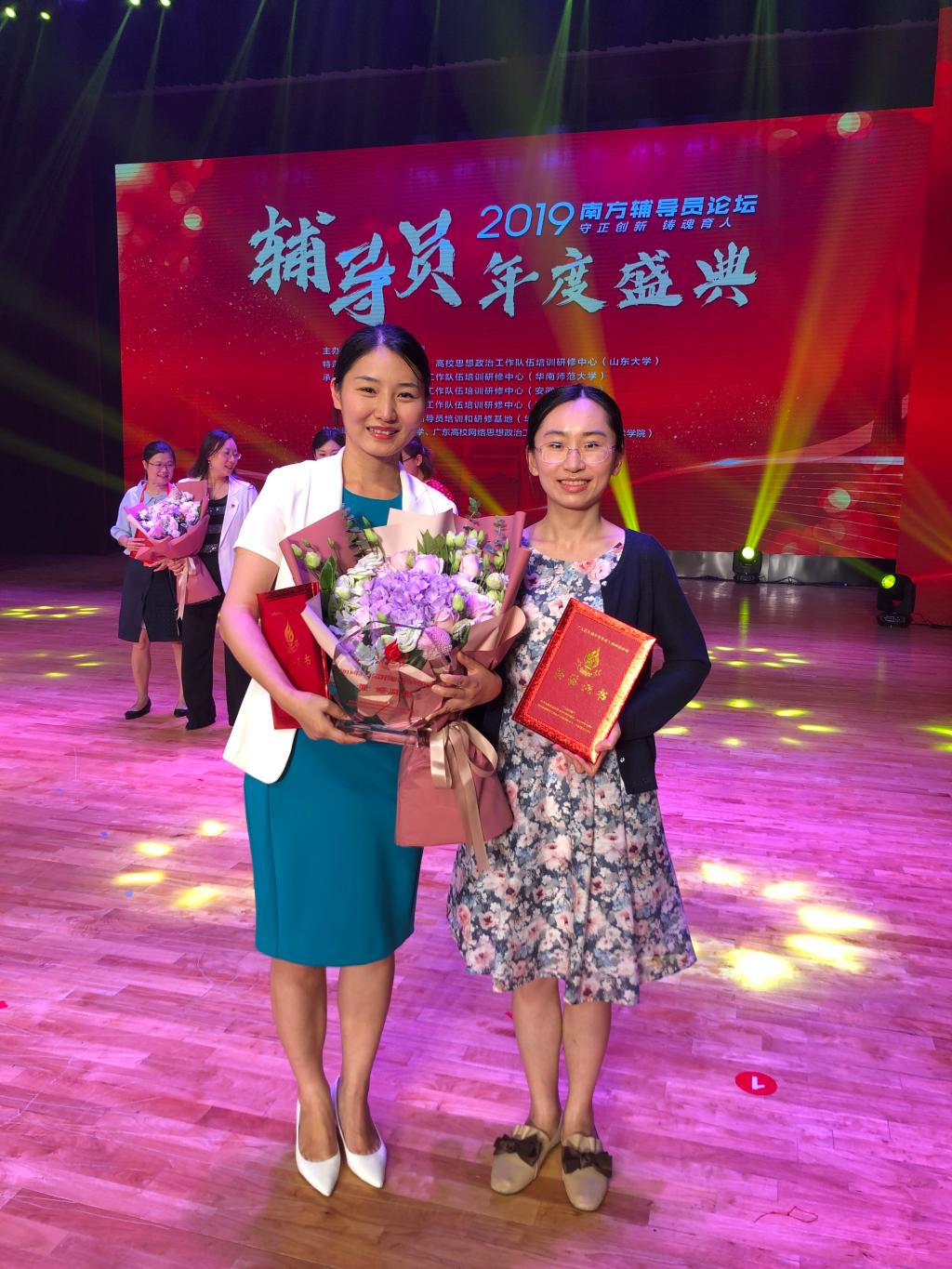 2019年6月14日,我校信息学院辅导员董婷、中文学院辅导员朱倩渝应邀参加了由广东省教育厅主办,华南农业大学承办的“守正创新,铸魂育人”2019年南方辅导员论坛暨2018年广东省高校辅导员年度人物颁奖典礼。广东省教育厅、海南省教育厅负责同志,有关高校领导,广东省各普通高校学生工作部部长,安徽、山东、湖南、广东四省高校思想政治工作队伍培训研修中心负责人及代表,安徽、山东、湖南、广东、海南五省骨干辅导员代表出席了本次论坛。论坛对广东高校辅导员2018年度人物进行表彰颁奖,我校党委常委、副校长刘海春出席会议并为获奖者颁奖。