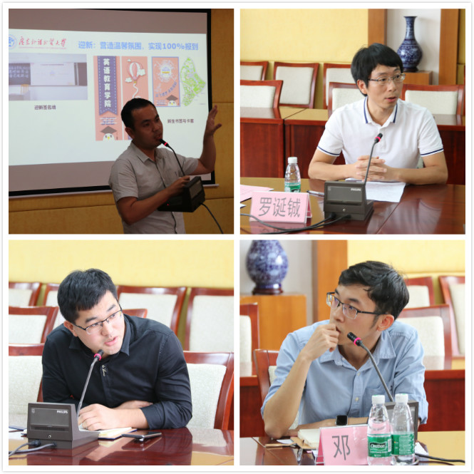 新生辅导员代表罗诞铖、林泽龙、邓煜分别做了新生工作经验介绍。罗诞铖表示,东语学院以营造学生“归属感”为主旨,通过召开新生家长会、系统进行新生教育、深入走访学生宿舍等来建立新生的信任感和归属感;林泽龙认为辅导员要从掌握信息、建立关系,树立意识出发,掌握工作方法,善用学生干部,他认为辅导员应该成为一座灯塔,照亮学生的同时也照亮自己;邓煜从知心者、陪伴者、引路人三个角色定位出发,介绍新生辅导员的工作方法,认为工作中要掌握技巧,去繁就简,提高效率。