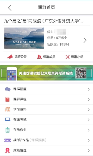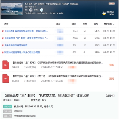 九个易之“易”同战役优课群以全面有趣的内容、新颖多样的形式得到全校学生的认可,并获得学生广泛好评,育人成效显著。截至4月28日,共有6795名广外学子参与优课群,活跃度高达19594,有效传递疫情防控知识;5309人参与优课话题讨论,分享自己的学习感悟;123篇“抗疫”文学作品,凝聚战疫力量;24幅战“疫”画作,鼓舞战疫士气。真正实现了“育人全过程、影响全方位、传播全效能”的思政育人高能量。