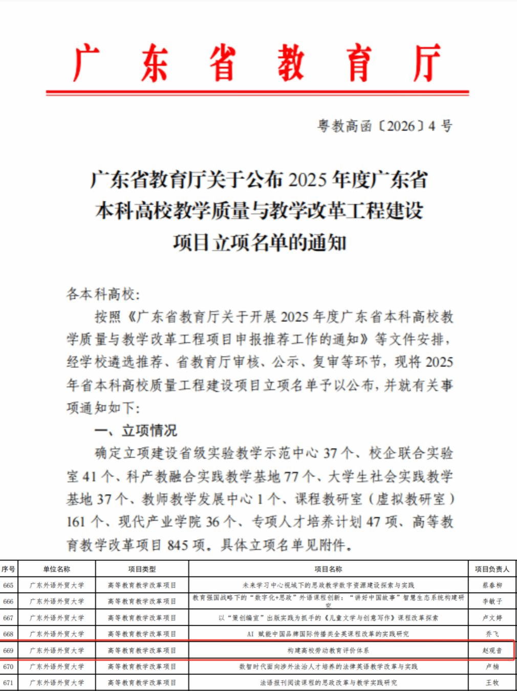 近日,广东省教育厅公布了2025年度广东省本科高校教学质量与教学改革工程建设项目立项名单,我校34个项目获批立项。其中,学生工作部申报的项目《构建高校劳动教育评价体系》成功入选。