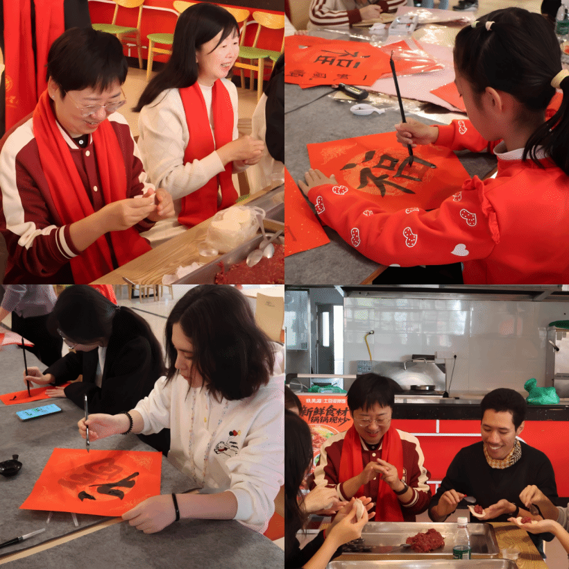 学校为每位留校同学准备了新春慰问礼包、红包及绿植,葛小月副书记与在场领导老师为同学们一一送上。除了传统的红包与年货,现场还精心设置了年俗体验区:同学们亲手尝试制作糖画与冰糖葫芦,在甜香四溢中创作出属于自己的生肖“小骏马”;包饺子、写春联区域同样人气高涨,师生们撸起袖子填馅捏褶、挥毫泼墨,将对新年的祈愿一并包进饺子、写进红纸。欢声笑语间,年的味道愈发浓郁。