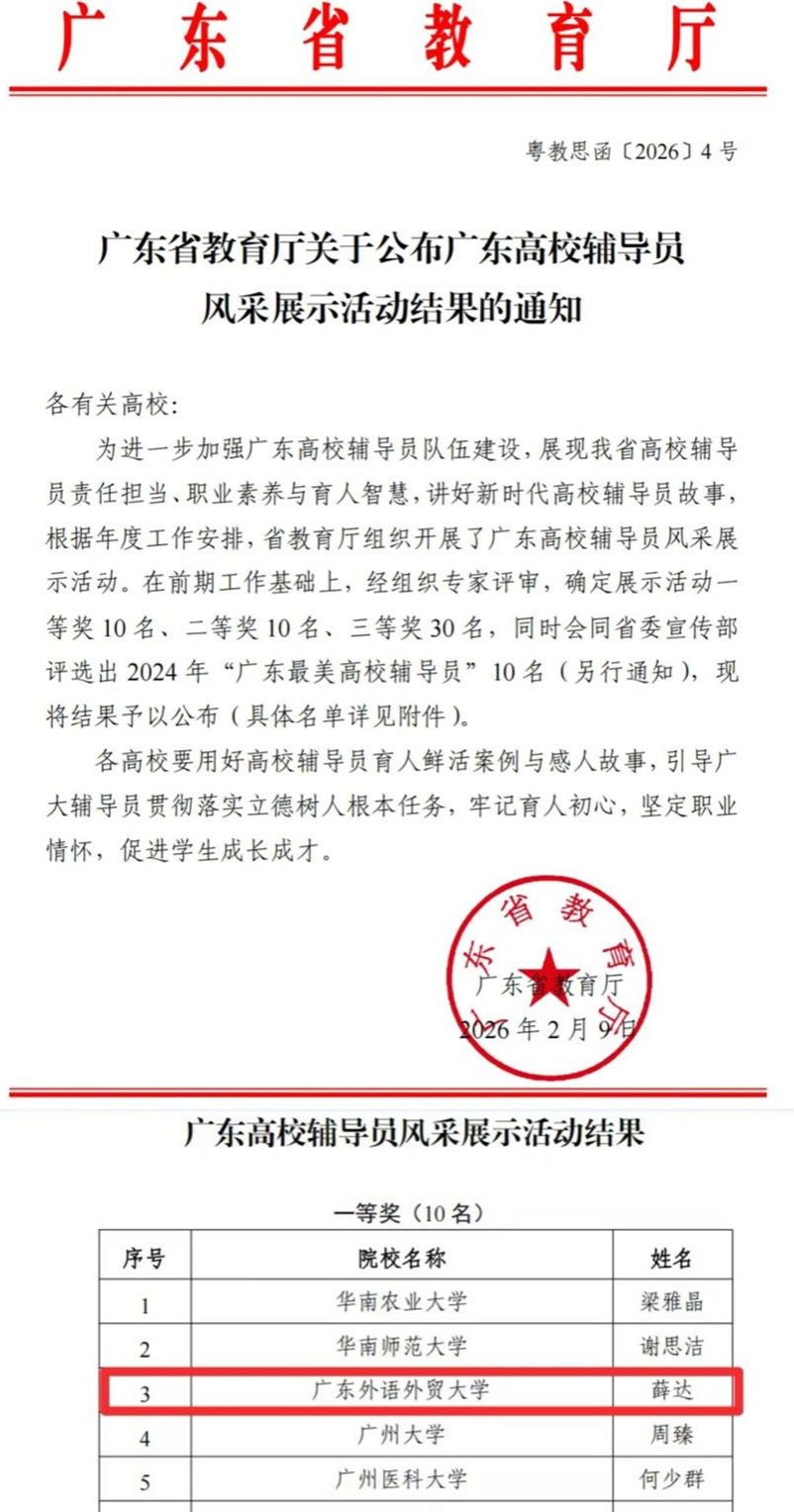 近日,广东高校辅导员风采展示活动评选结果正式揭晓,我校数学与统计学院辅导员薛达凭借扎实的育人功底、鲜明的职业风采与出色的综合表现,在全省众多选手中脱颖而出,荣获一等奖。