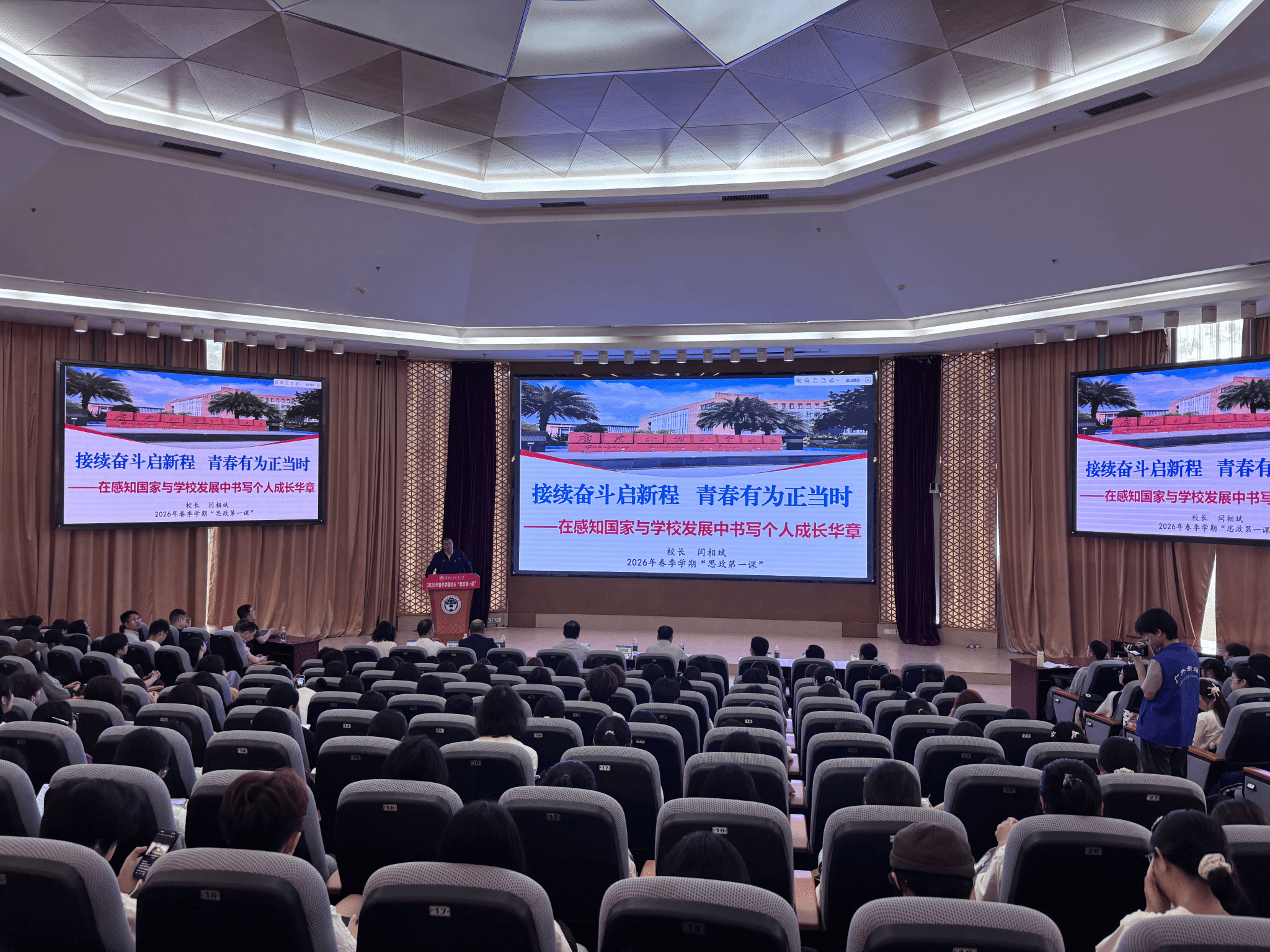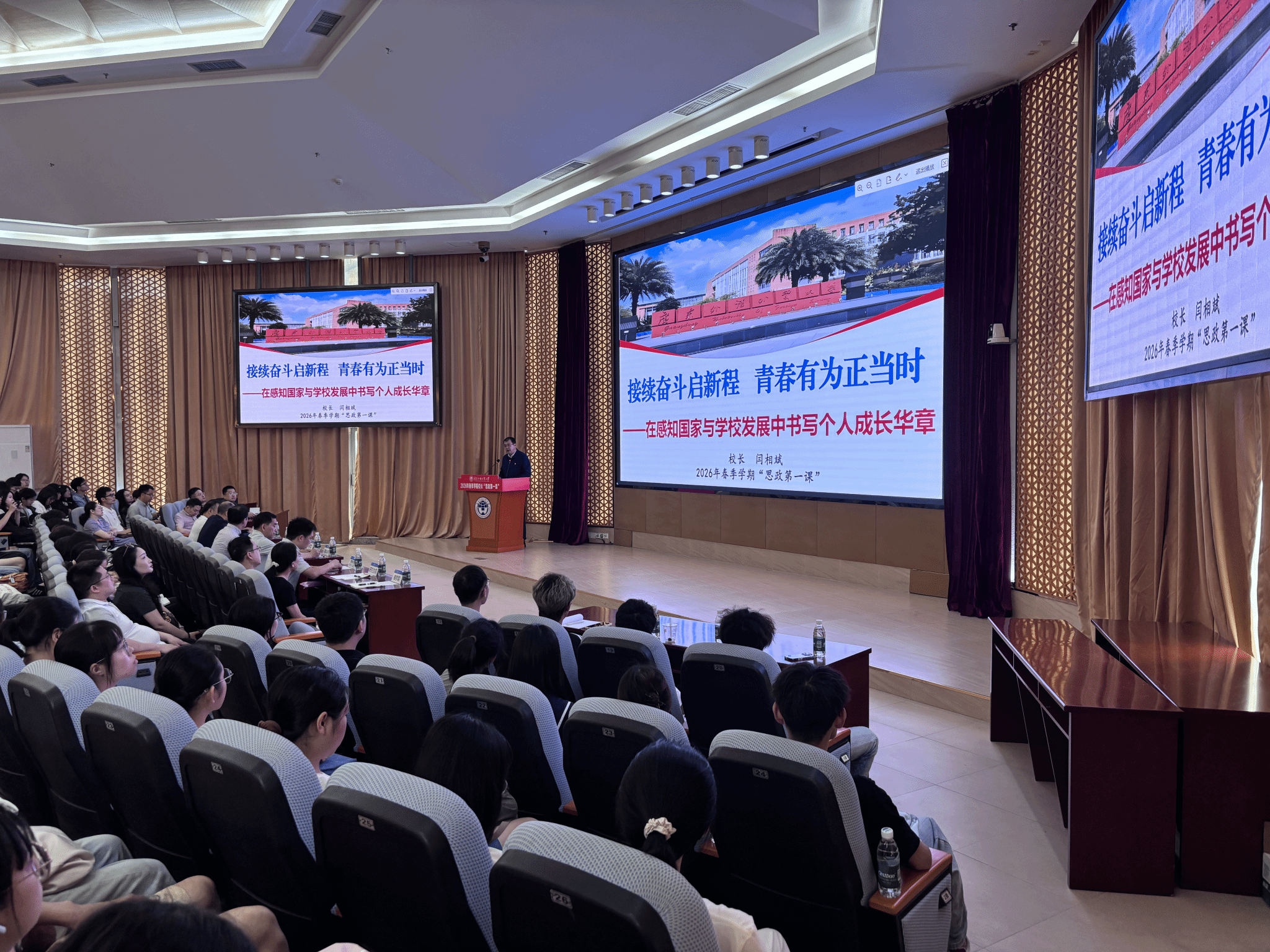 4月14日上午,广东外语外贸大学2026年春季学期校长“思政第一课”在大学城校区八角楼会议室举行。校党委副书记、校长闫相斌以“持续奋斗启新程,青春有为正当时——在感知国家与学校发展中书写个人成长华章”为主题,为在场师生带来了一场立意高远、内容鲜活的思政大课。2025级学生朋辈导师代表全程参与学习,深受启发、倍感振奋。