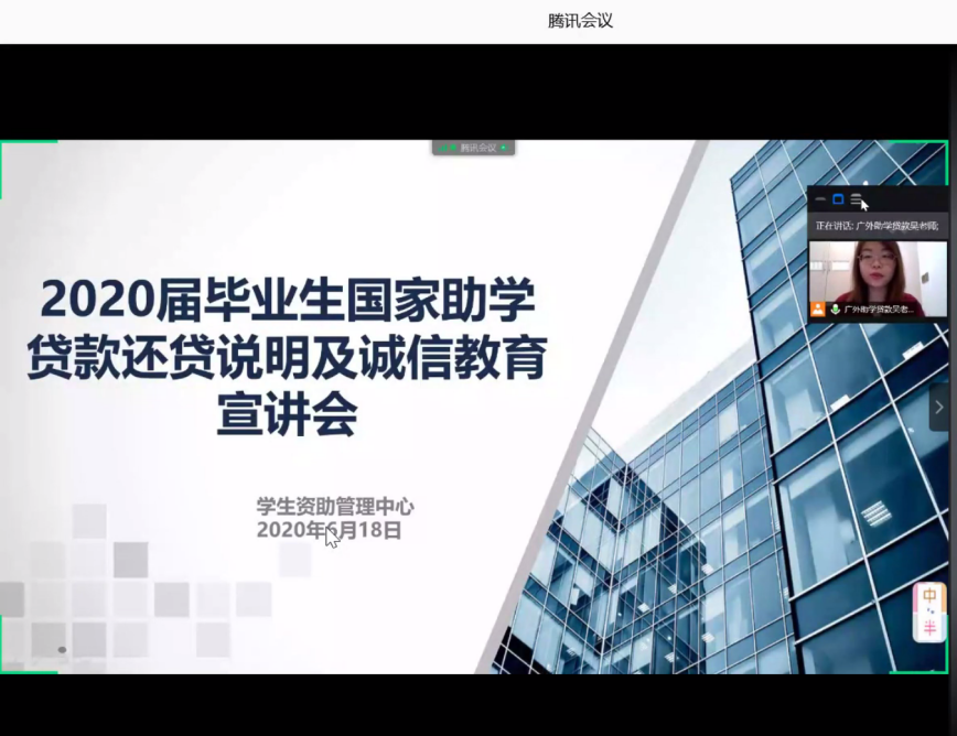 6月18日,学生工作部(处)学生资助管理中心举办了“2020届毕业生国家助学贷款还贷说明及诚信教育”线上宣讲会。本次会议由广外助学贷款负责老师吴宛姗主持,学生处副处长叶开、学生处学生资助管理中心科长叶祥杰、各学院济困指导老师和2020届高校助学贷款毕业生等共计约170余人参加本次会议。