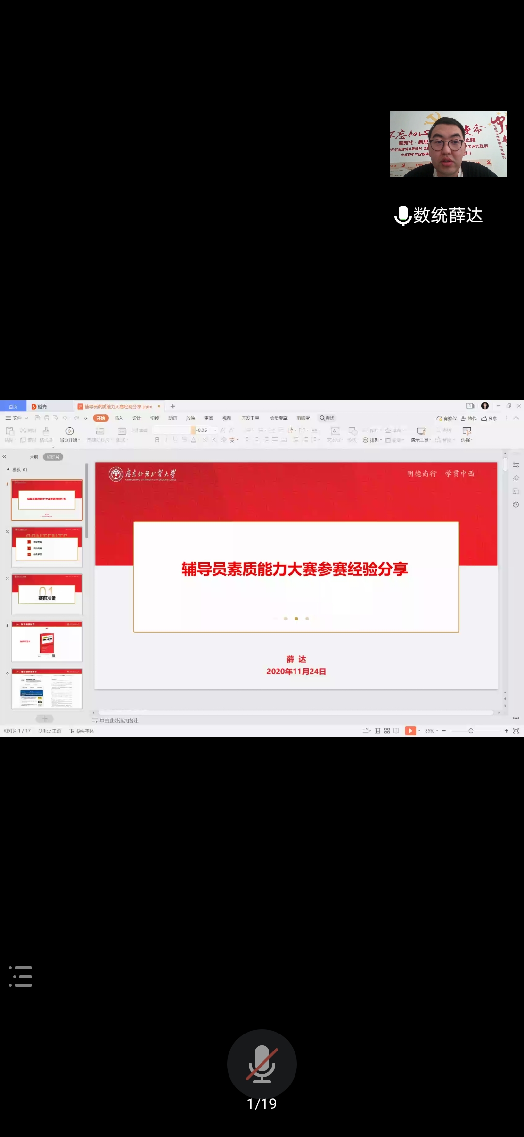 薛达从参赛选手的角度分享了参加全省高校辅导员素质能力大赛的比赛经验和心得体会。他从笔试、网文写作、案例分析和谈心谈话等方面进行分享,认为夯实理论基础是关键,突破语言表达是重点,案例分享和谈心谈话则需要集合实践,抓住问题的核心和要点。他还强调,辅导员素质能力大赛是对辅导员工作的总结和梳理,做好赛后分析有助于指导具体的学生工作。
