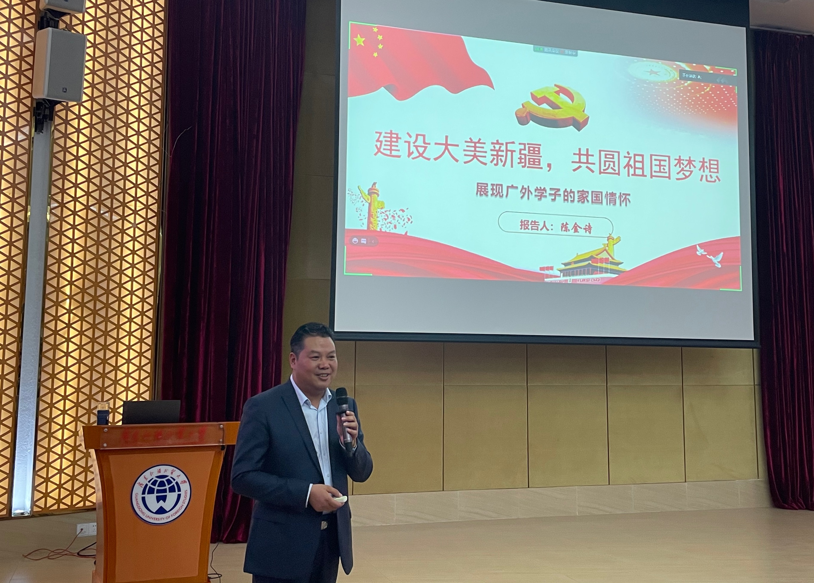3月26日晚,庆祝中国共产党成立100周年“永远跟党走,建功新时代”系列活动之“广外人在新疆”分享会在南校区八角楼报告厅举办。英语教育学院副院长,中央组织部、团中央第19、20批博士服务团成员陈金诗教授应邀为我校民族生开讲,学生工作部副部长国佳主持分享会。