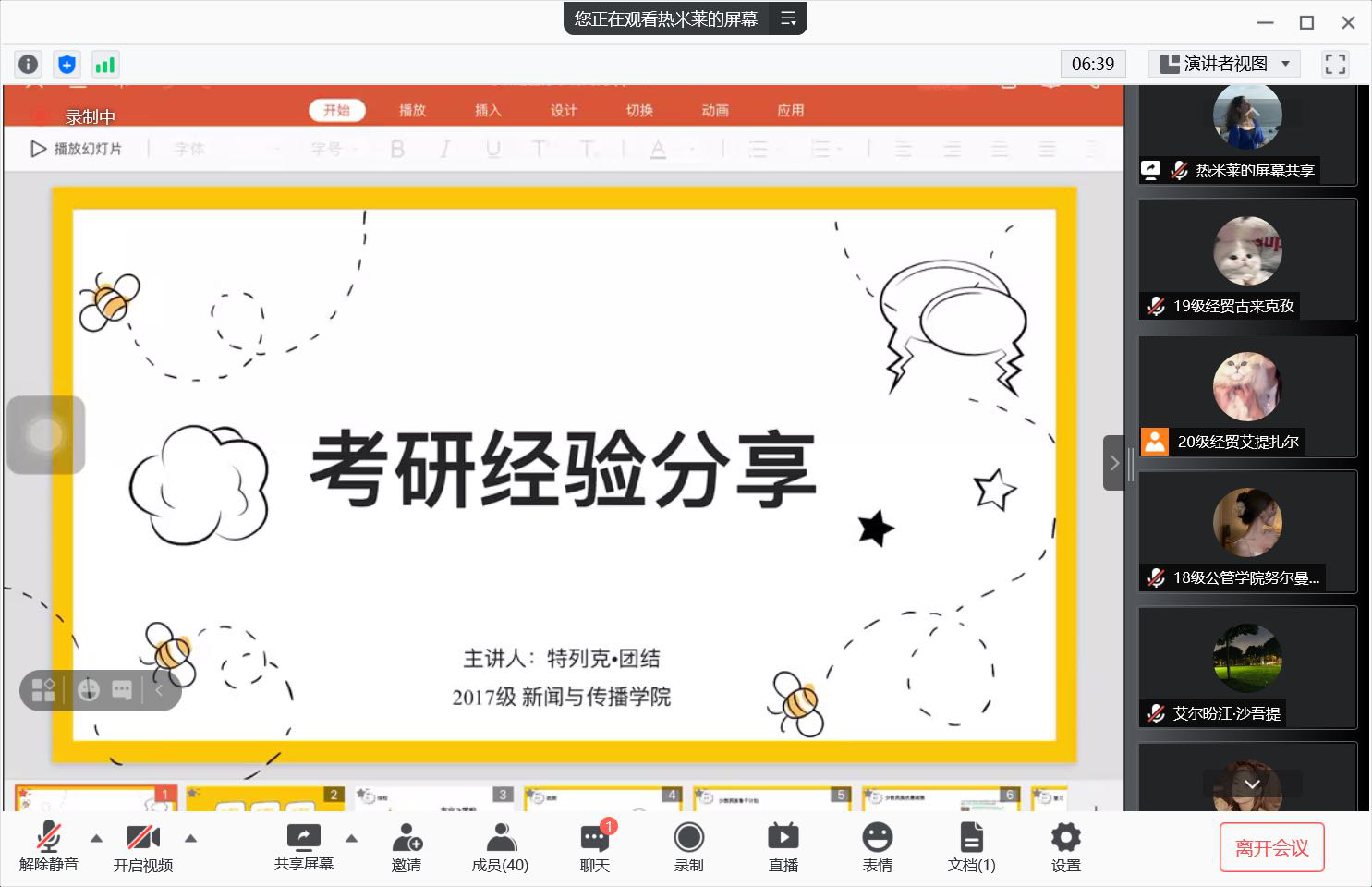 我校2019届商学院工商管理专业毕业生斯马衣力,在这次分享过程中向师弟师妹介绍了自己报考公务员的经验,从岗位选择、针对性备考、考试注意事项等方面为师弟师妹提供帮助,勉励学弟、学妹尽早明确自己的目标和方向,少走“弯路”。我校2021届新闻与传播学院毕业生特列克,向大家分享了自己的考研经历,她从相关政策解读、选择目标院校、专业复习等方面全面为师弟师妹提供考研指导。我校2021届经贸学院经济学专业毕业生艾尔盼江,分享了自己实习求职经历,通过讲述自己在笔试、面试中的经验,表示制作简历的重要性,把握每一次求职的机会,并从中吸取经验。