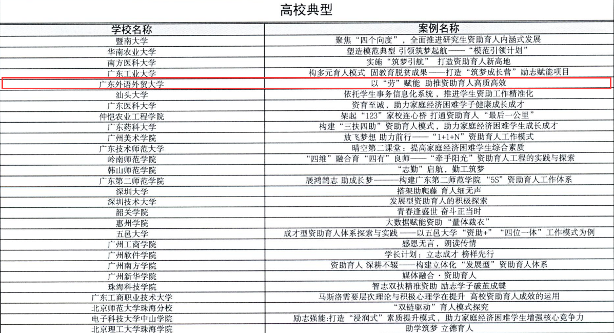 我校在评选中荣获佳绩,《以“劳”赋能 助推资助育人高质高效》获广东省2022年度高校学生资助典型案例,张悦欢、谢蓉老师获广东省学生资助工作者典型,许嘉航同学获广东省年度励志学生成长成才典型。